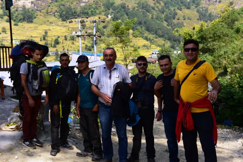 Dağ tırmanışı için toplanma bölgesinde birçok turist grubu var ve bizim gibi aşağı yukarı her grup “taşıyıcı”lar ve rehber eşliğinde tırmanıyor Himalayalara. Taşıyıcı dediğimiz kişiler gelen turistlerin ağır çantalarını taşıyan yaşları 20-30 arası değişen gençler. Bizim ekibimize çantalarımızın ağırlığına göre iki taşıyıcı uygun bulunmuş ve bir de rehberimiz var. 4 kişi de bizim ekip, ettik 7 kişi.