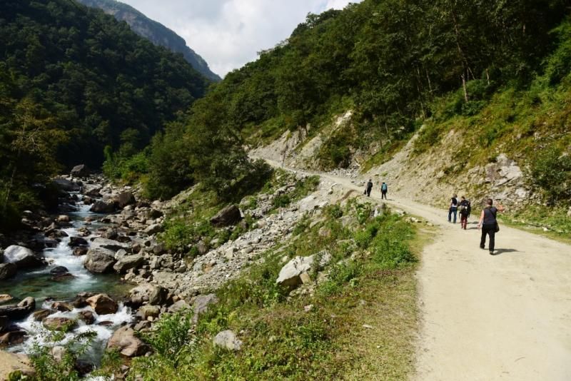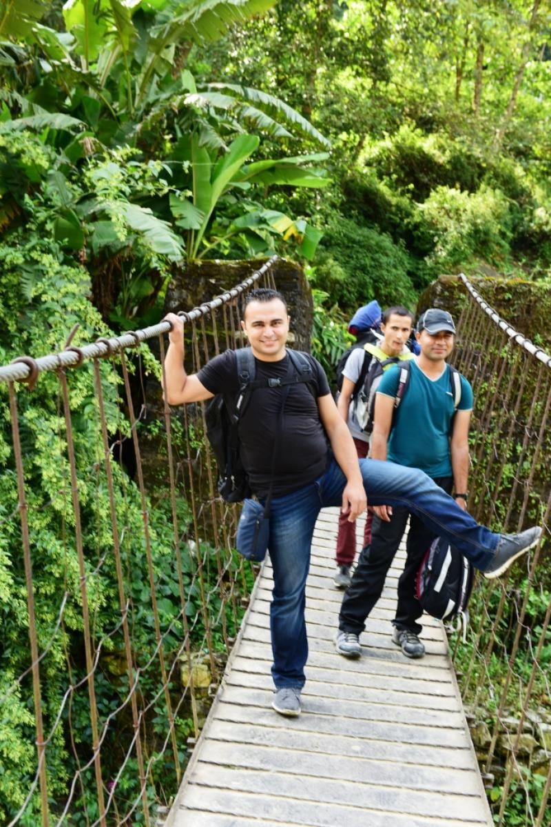 Tırmanışın ilk bölümlerinde küçük köylerden ve asma köprülerden geçtik. Kayalardan akan küçük şelaleler, doğanın yeşilinden görünmeyen toprak, çoğu kez sesini yükselten ama görmekte zorlandığımız bize yol boyu eşlik eden debisi yüksek akan su…
