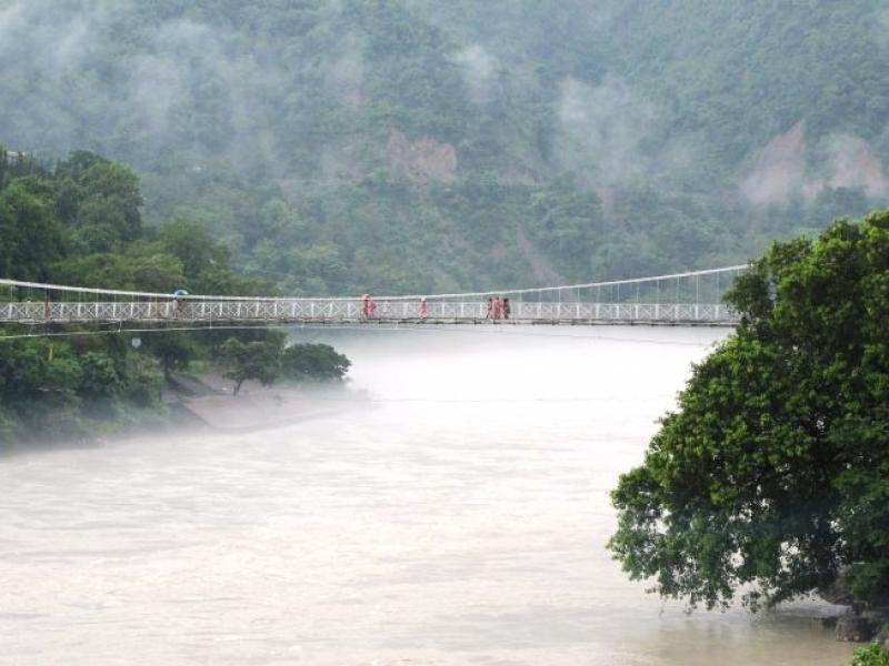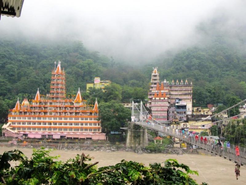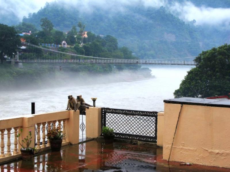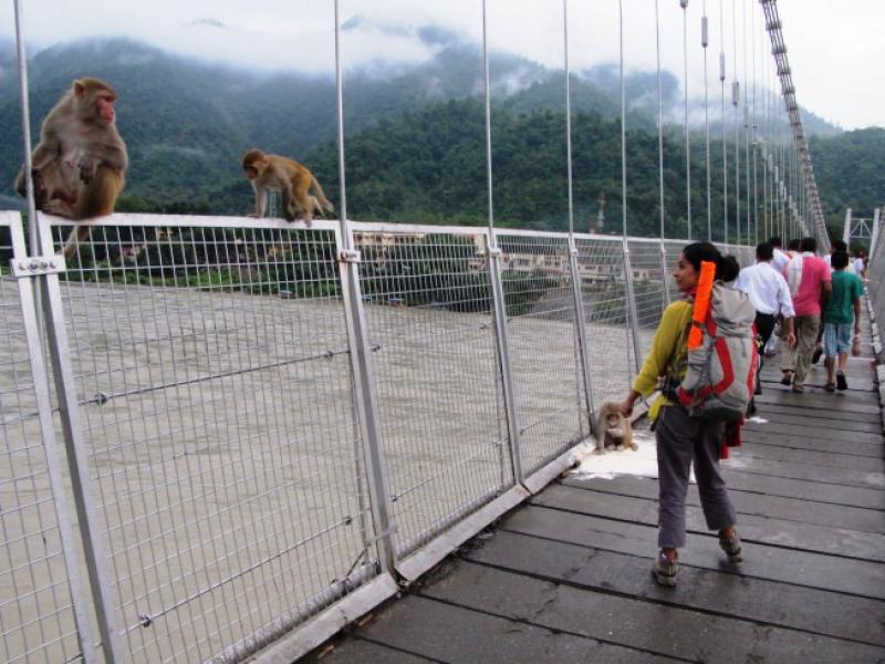 Rishikesh iki ana bölgeye ayrılmış durumda; kalabalık ve pek de çekici olmayan merkez ve daha kuzeyde Ganj kenarında bulunan Himalaya manzaralarıyla çevrili güzeller güzeli, bizim de konakladığımız bölge. Ganj Nehri’nin ikiye böldüğü kuzeydeki bu bölgenin iki yakasını Ram Jhula ve Lakshman Jhula köprüleri birleştiriyor. Her iki köprü de maymunların işgali altında… Korkuluklara tırmanan, insanların arasında koşturan bir dolu maymun ve aralarında yürüyen renkli sarili kadınlar, Hint münzevileri (sadular) ve tabii ki kutsal inekler ile bu iki köprü sürekli canlı, renkli ve şenlikli bir manzara oluşturuyor. Rishikesh turistler için bir cennet. Hem yoga, meditasyon, müzik ve dans kursları, birçok konaklama imkânı, her zevke göre (hatta pizza, hamburger gibi batılı yemekleri bile bulabileceğiniz) restoran ve kafeleri ile konforlu; hem de saduları, aşramları, kutsal nehri ziyarete ve ibadete gelmiş yerli halkı ile otantik ve doğulu…