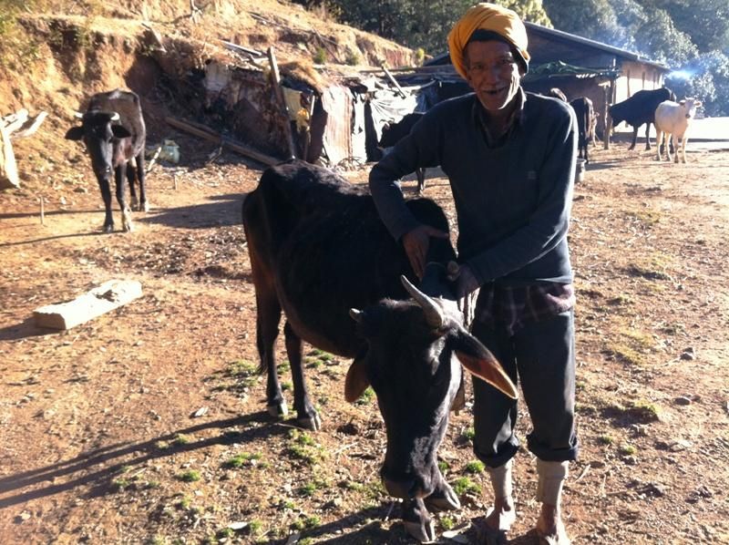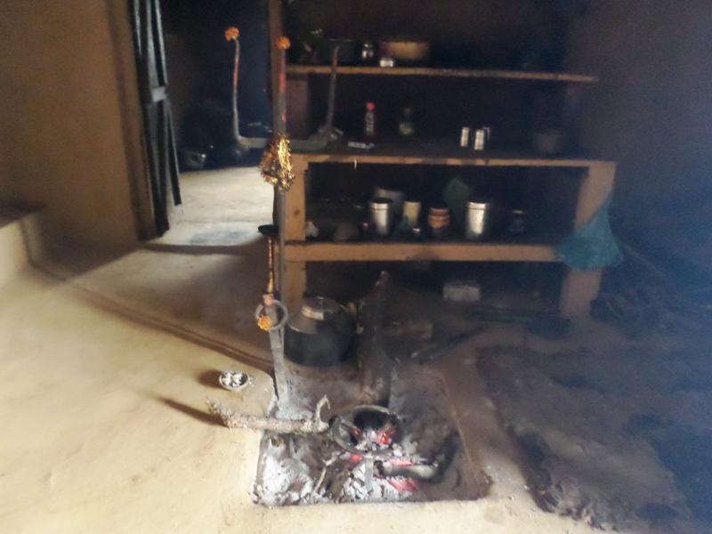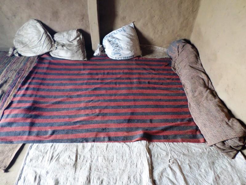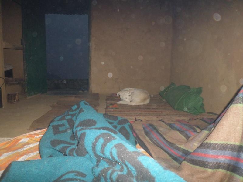 3 farklı kulübe var; ilki ineğin bulunduğu, ikincisi köpeğin bulunduğu ve üçüncüsü de bizim bulunduğumuz. Tamamen çamurdan yapılmış ve aslına bakılırsa pek pis de sayılmaz. Normal olarak çok tozlu ancak çiftlik görüntüsünde olmasına rağmen tapınak gibi temiz tutuyor. Akşam olduğunda yemek için tekrar ateşi yakıyor. Kalacağımız oda ile ateşin yandığı yer aynı ve sürekli olarak evin içinde inanılmaz bir duman var. İçeride durmak mümkün değil, dışarıda bekliyoruz ancak güneş battıktan sonra 2.200 metre yükseklikte hava oldukça hızlı soğuyor. Yapacak bir şey yok, içeri giriyoruz.