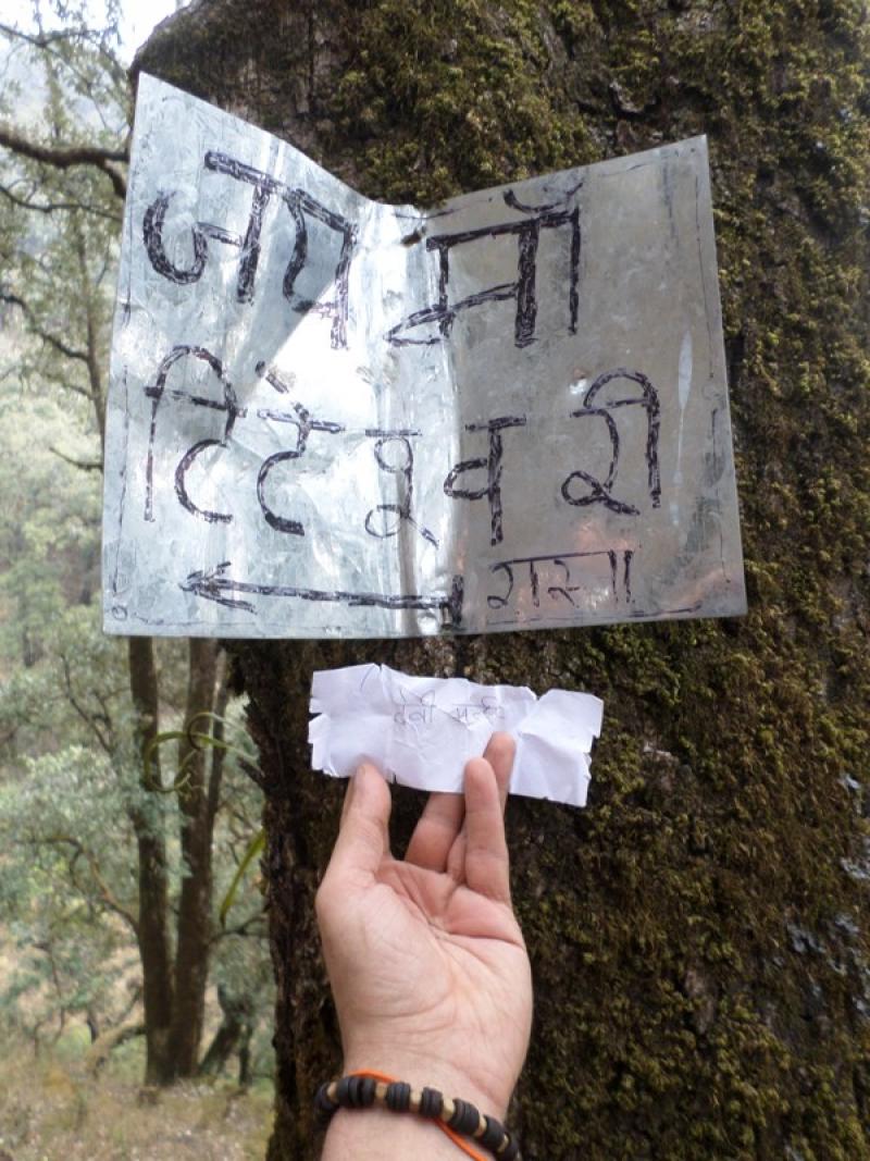 Sonunda Arun’un bahsettiği tapınağın yolunu gösteren metal işaretlerden birini buluyoruz! Tabii ki bu işaretin bulunduğu yer, normal bir patika yolu. Sonunda aslında olmamız gereken yolu bulduk ve patikadan çıkmaya devam ettik. Ettik ama ben o kadar bitkin bir durumdayım ki ne kol ne bacaklarda güç kaldı. Gilles bile o kadar kondisyonlu ve çok daha hafif olmasına rağmen yorulmuş durumda artık.