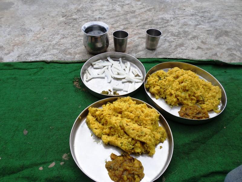 Çok zor şartlarda yaşayan bir adam olan rahip, inanılmaz sıcak ve yardımsever davranıyor. Hemen yere bir kilim seriyor ve oturun dinlenin şeklinde bir şeyler diyor. Üzerimdeki tişört ve onun üzerindeki polar tamamen su olmuş durumda. İkisini de çıkartıp kuruması için güneşe bırakıyorum ve kilimde oturup güneşin altında yatıyorum. Buraya ulaşmadan yarım saat kadar önce son suyumuzu da içmiştik o yüzden tam içecek su isteyecekken sütlü ve bol şekerli çaylarımızı hazırlayıp getiriyor. Normalde hiç kullanmam şeker ama kaybettiğim enerjiyi geri kazanmak adına o kadar güzel geliyor ki anlatamam. Ardından safranlı sebzeli pilav ve her gün Arun’un çiftliğinde de yediğimiz “Dal” geliyor. Tek farkı kesinlikle çok daha baharatlı ve haliyle çok daha iyi oluşu! Adam başı yaklaşık 1 kg. pilav koyuyor ve dahası da var diyor. Yiyip, içip, güneş altında yatınca vücut kendine geliyor.
