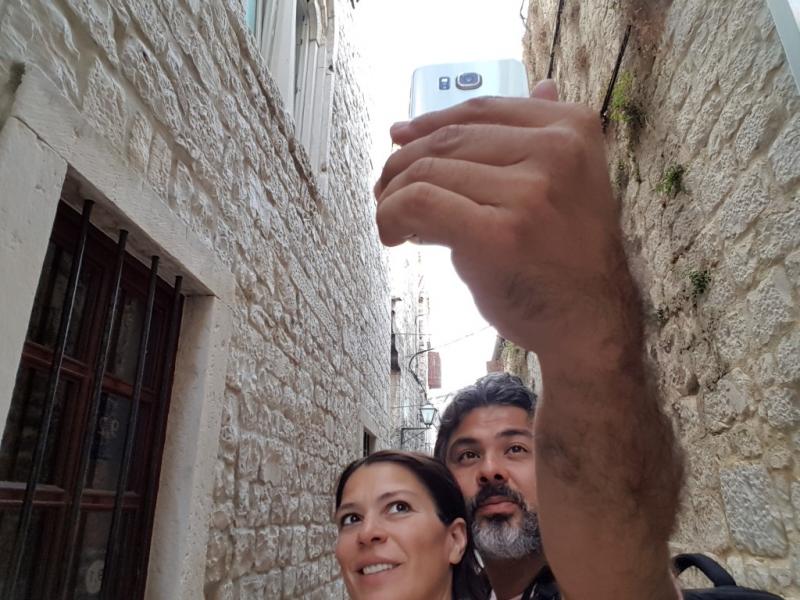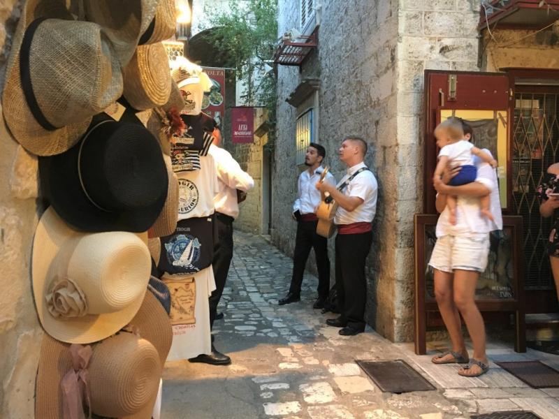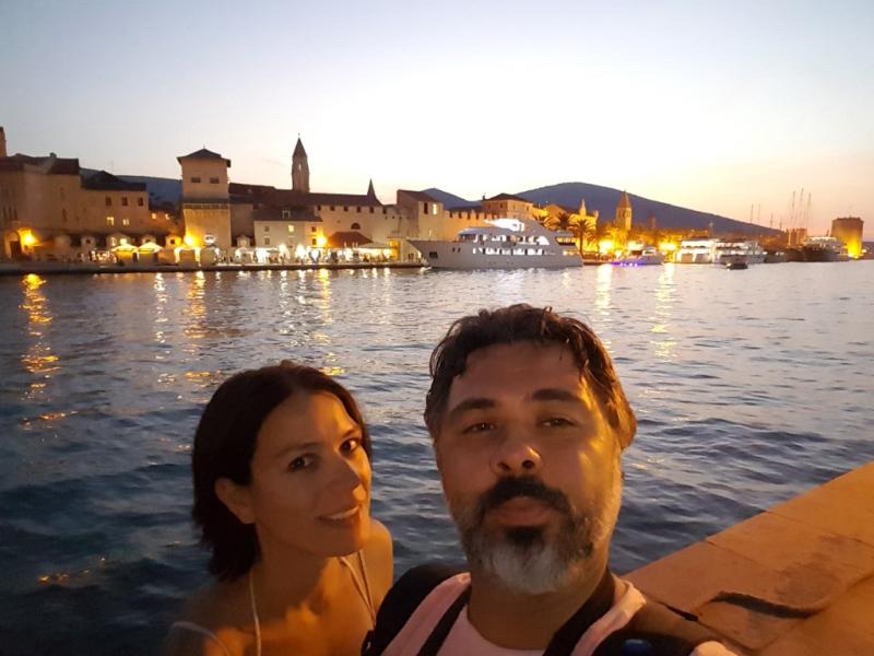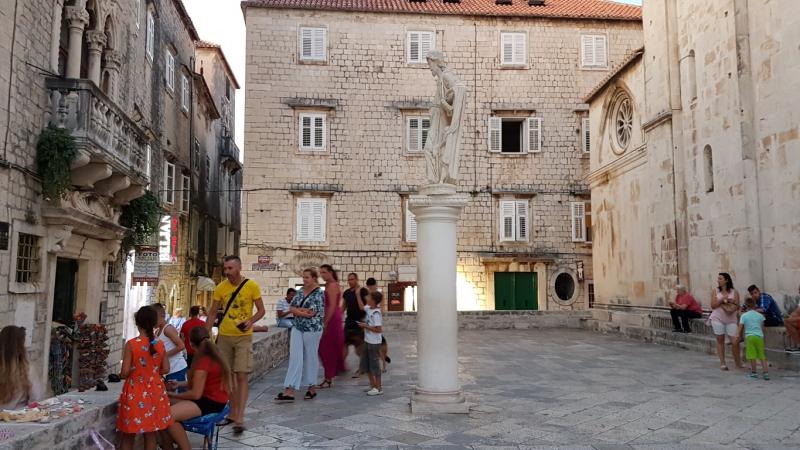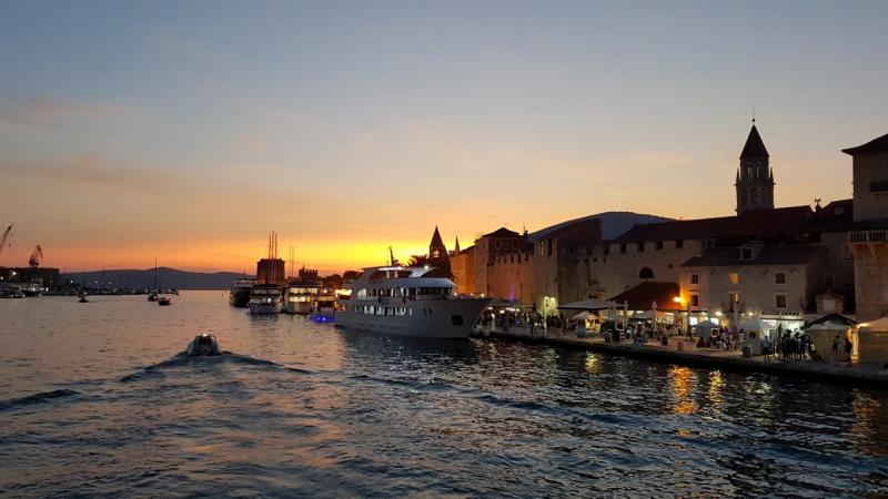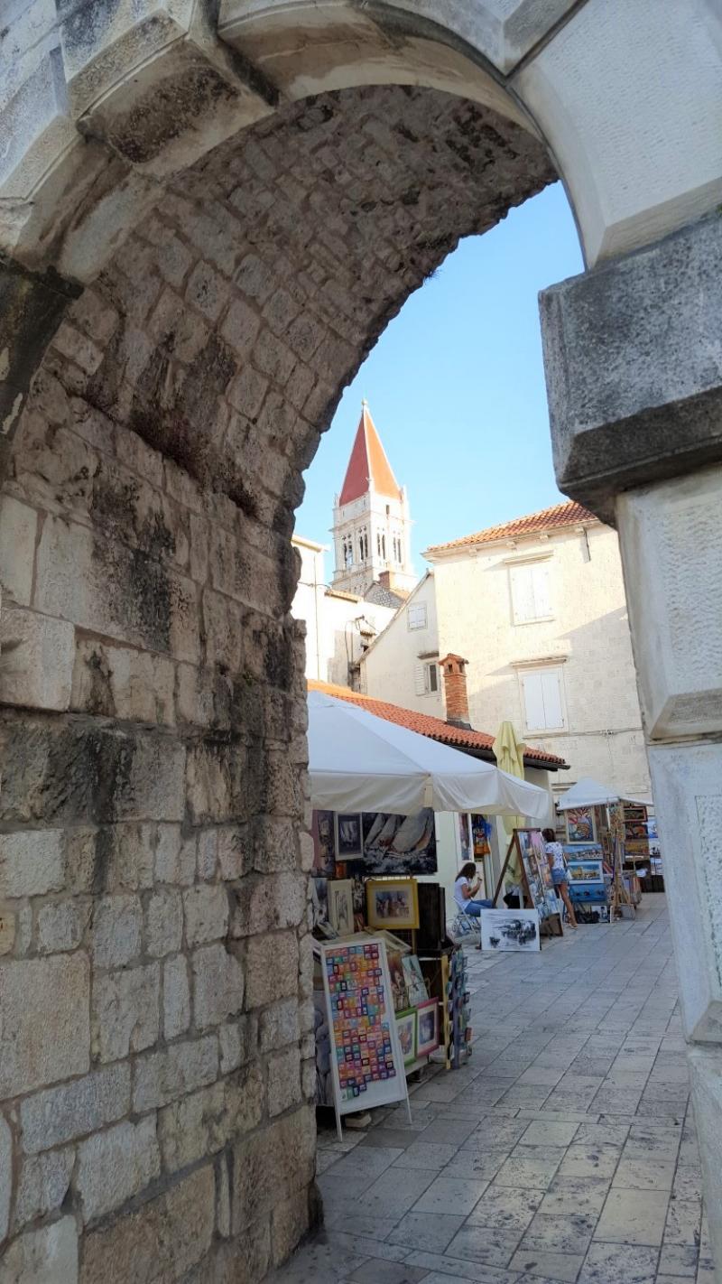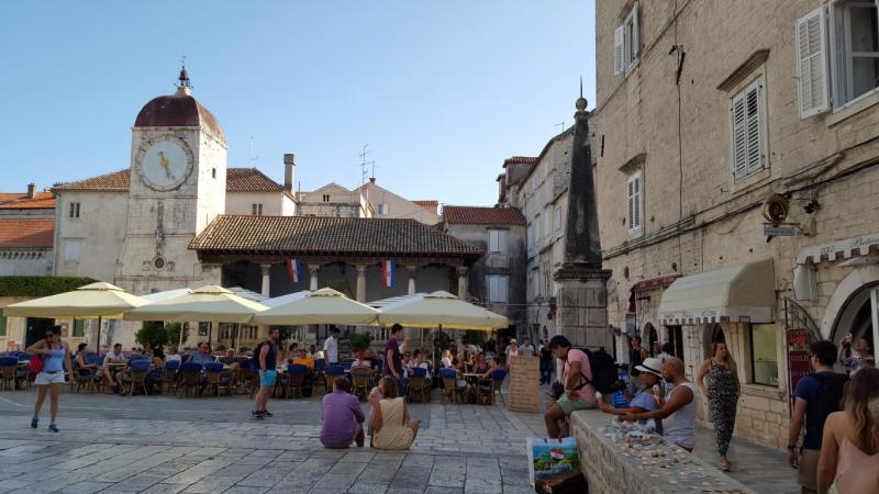 Dalmaçya kıyılarında küçük bir ada üzerine kurulmuş olan bu tarihî kent ana karaya taş bir köprü ile bağlanmış durumda. Biz ana kara tarafında arabamızı park edip köprüyü yürüyerek geçerek meşhur tarihî kente ulaştık. Trogir’le ilk buluşmamızda Murat’la birbirimize baktık ve “Ya keşke sabah erken saatlerde buraya gelseydik” dedik çünkü mistik ve sizi içine çeken bir havası var buranın.