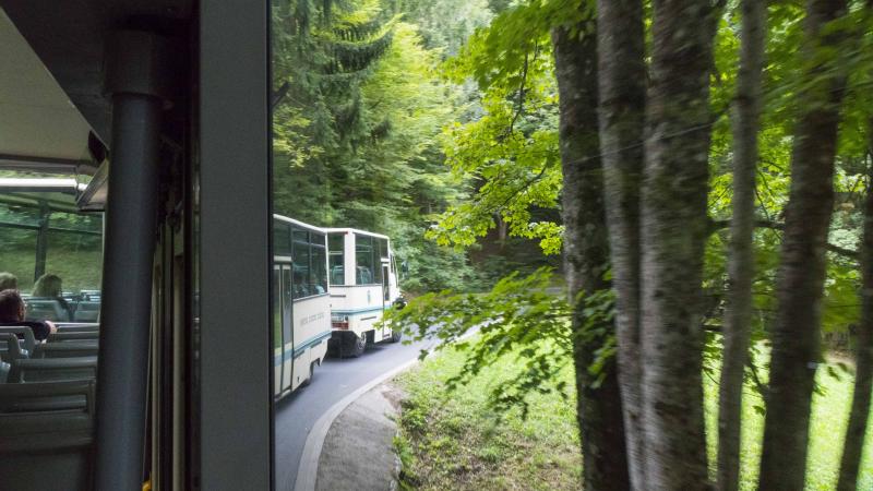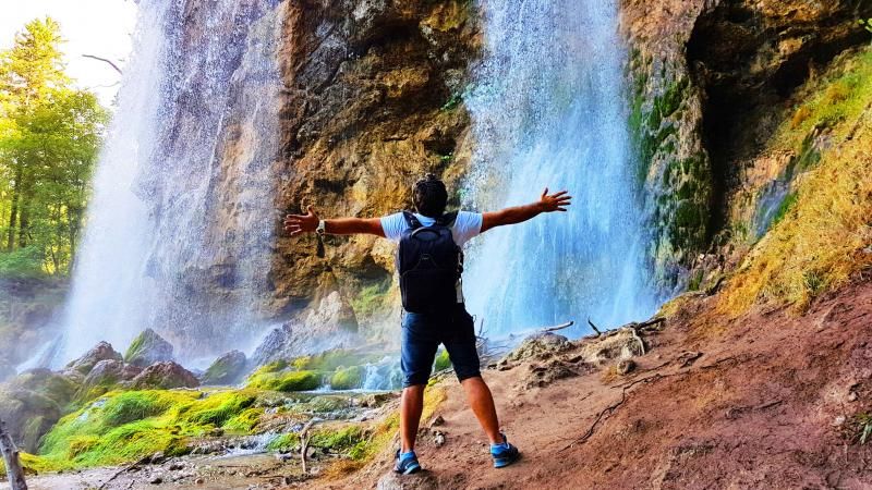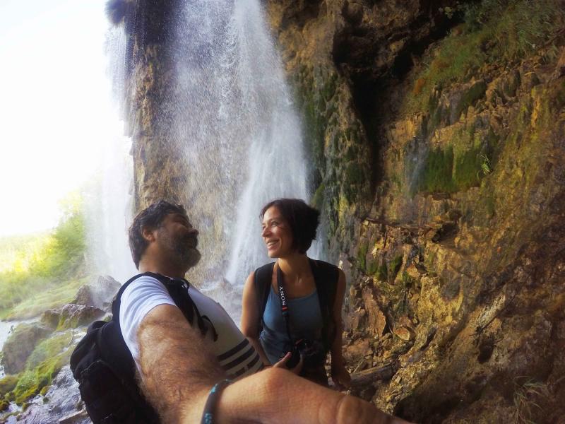 Yol boyunca ormanlık alanlar içinden geçiyoruz. Duyduklarımız arasında kuş cıvıltıları, akan su sesleri ve çokça de İtalyanca konuşmalar var. İtalya’ya yakınlığından olsa gerek bu bölgede epey İtalyan turiste rastladık. Bir hayli yürüdükten sonra muhteşem bir şelale ile karşılaşıyoruz.