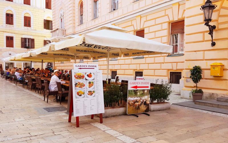 Zadar’ın surlar içerisinde kalan tarihi bölümü kentin en popüler bölgesi. Bu nedenle biz de arabamızı hemen surların dışındaki park yerine bırakıp valizlerimizle sur içinde kalacağımız daireye gidiyoruz. Yerimiz çok merkezi, apartmandan indiğimiz gibi etrafta restoranlar, kafeler, hediyelik eşya dükkanları var. Tam anlamıyla kentin kalbindeyiz. Zadar’a vardığımızda, gün içinde Plitvice Gölleri Doğal Parkı’nda yaptığımız yürüyüşten dolayı o kadar yorgunduk ki pek dışarı çıkıp dolaşacak halimiz kalmamıştı. Varışımız da zaten saat 22.30’u bulunca doğrudan eve yerleştik ve yemeğe gittik. Zadar’da farklı mutfaklardan örnekleri rahatlıkla bulabiliyorsunuz. Ancak en yaygın mutfak İtalyan mutfağı ve deniz ürünleri. Biz ilk akşam hızlı da olmasını istediğimiz için İtalyan mutfağını tercih ettik.
