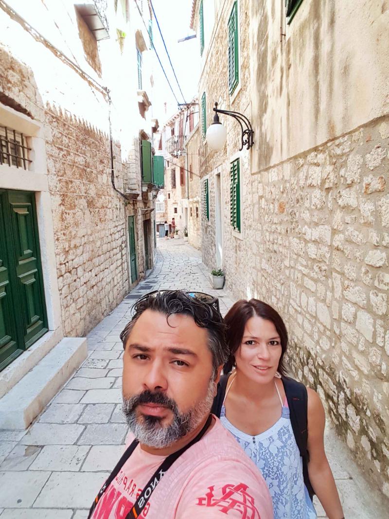 Sibenik’in tarihi kent bölgesi içine araç ile girilmiyor. Bu nedenle hemen tarihî kentin girişinde yer alan otoparka aracımızı park edip valizlerimizi alıp kiraladığımız eve doğru yürüyoruz. Ev eski kentin tam göbeğinde yaklaşık 200 senelik bir bina. İçi ise son derece modern dizayn edilmiş. Bu ev kentin tam merkezinde. Eve yerleştiğimiz gibi valizleri bırakıp Sibenik’i keşfe başlıyoruz.