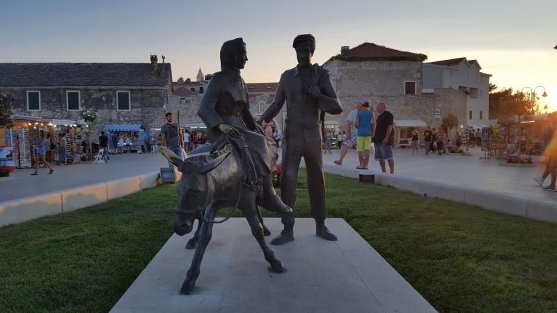 Adanın girişinde eşek üzerinde oturmuş yerli bir kadın ve yanında ayakta duran eşinin heykeli var. Bu bölge aynı zamanda hediyelik eşya stantlarını da göreceğiniz dairesel bir meydan.