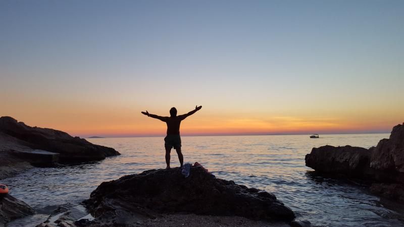 Adanın en güzel plajlarından biri Radoja Plajı. Gerçi tüm plajları birbirinden güzel. Biz de tam gün batımında denizde olmaya karar verdiğimiz için koştura koştura ilk bulduğumuz merdivenlerden deniz kenarına indik. Sadece biz vardık. Manzara da deniz de nefisti.