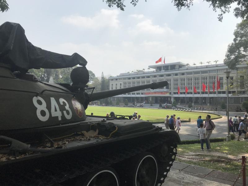Yeniden Birleşme Sarayı 1962-1966 yılları arasında yapılmış ve ABD'nin desteklediği Güney Vietnam yönetiminin karargahı olarak kullanılmış. 30 Nisan 1975'te Kuzey Vietnam kuvvetlerine ait bir tankın Saray'ın kapısından içeri girmesi ile savaş son bulmuş ve kuzey-güney birleşmesi ile bağımsızlık ilan edilmiş. ABD kuvvetleri o kadar hazırlıksız yakalanmışlar ki tank kapıdan girdiğinde ABD helikopterleri ile tahliye halen devam ediyormuş. O günün anısına bir tank saraya dönük olarak aynı yerde sergileniyor. Sarayın içini gezmeyi ihmal etmeyin. Ziyaret her gün 07.00-11.00 ile 13.00-16.00 saatleri arası ve giriş ücreti 40.000 Dong.