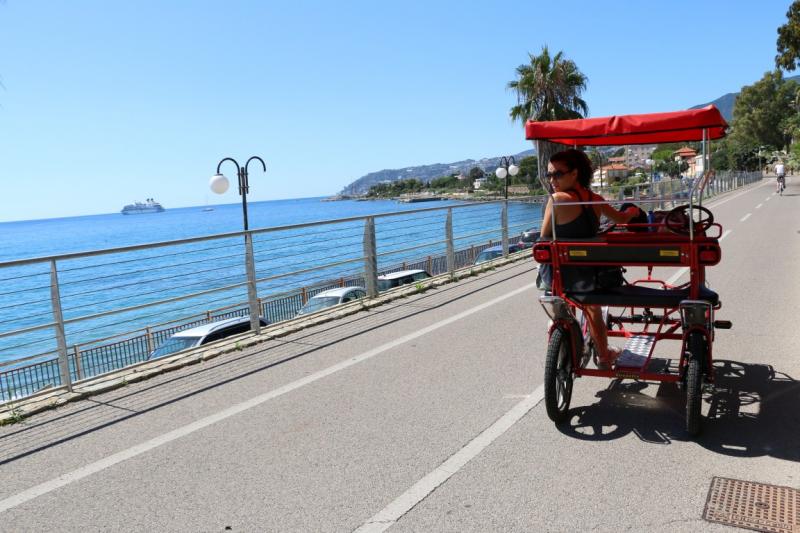 Menton’a geldik ama amacımız San Remo’ya ulaşmak. Normal şartlarda Menton otobüs terminalinden her yarım saatte bir San Remo’ya otobüs var. Ancak maalesef biz son otobüsü 5 dakika gecikme ile kaçırdık. Eee tren yolunda da kaza var. Yapılacak tek şey taksi ile İtalya tarafındaki Ventimiglia’ya geçip oradan da trene binerek San Remo’ya geçmek.