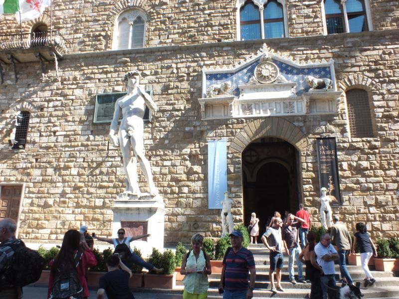 İlk durağımız Galleria dell Accademia; Avrupa’da çizim, resim ve heykel tekniklerini öğretmek için açılan ilk okulmuş. Burada sergilenen en ünlü eser Michelangelo’nun Goliath’ı öldüren İncil kahramanı Davud’un 5.2 metre boyundaki çıplak heykeli. Heykel, Piazza della Signoria’ya yerleştirilmek üzere ısmarlanmış ancak daha sonra koruma amacı ile 1873’de Accademia’ya taşınmış. Şu anda bir kopyası Piazzale Michelangelo’ya yerleştirilmiş. Bu heykel Michelangelo’ya döneminin en iyi heykeltıraşı ünvanını kazandırmış. Tatil olması sebebi ile biz maalesef Galleria dell Accademia’ya giremedik o yüzden Davud Heykeli’nin meydanda ki kopyası ile yetinmek zorunda kaldık.