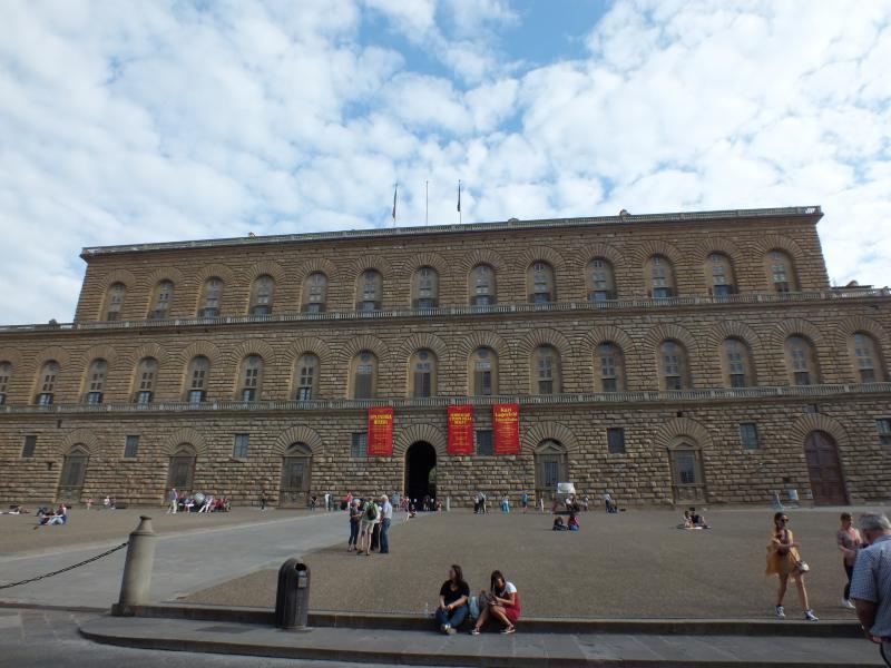 Palazzo Pitti’ye geldiğimizde sarayın önündeki eğimli yola herkes uzanmış güneşin tadını çıkarıyordu. 1457 yılında yapım çalışmalara başlanan saray, Luca Pitti için inşa edilmiş. Sarayın görkemli yapısı, zenginlik ve güç Pitti’nin Medicileri alt etmesi için yapılmış. Ancak binanın maliyetinin yüksekliği Pittileri iflasa sürüklerken, saray Medicilere satılmış. Palazzo Pitti odalarında da Medici koleksiyonları sergileniyor. Sarayın arka tarafında da Boboli Bahçeleri bulunuyor. Buraya zamanımız kısıtlı olduğu için giremiyoruz. Ama mutlaka buraya kadar gelip görülmesi gereken yerler arasında olduğunu söyleyebiliriz.