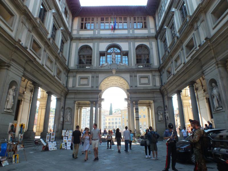 İtalya’nın en büyük sanat galerisi Uffizi ise, Pizza della Signoria Meydanı'nın hemen yanında yer alıyor. 1560-1580 yıllarında Dük I.Cosimo’nun ofisleri için inşa edilmiş. Bu galeride Medicilerin hazineleri sergilenmiş. Medicilerin yüzyıllar boyunca topladıkları koleksiyonları 1581 yılında buraya yerleştirilmiş. Şu anda da paha biçilmez resimlerden oluşan bir koleksiyon sergilenmektedir. Uffizi önünde her zaman uzun kuyruklar oluşuyor. Bu nedenle mutlaka internet üzerinden rezervasyon yapılarak gidilmesini öneriyoruz. Biz tatil gününe denk geldiğimiz için burayı da maalesef dışarıdan görmek ile yetiniyoruz.