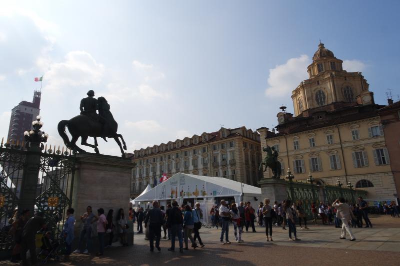 Festivalin dolu dolu yaşandığı bir diğer meydan ise; Piazza San Carlo. Gerçekten devasa bir meydan olmasına rağmen, meydan birbirinden farklı gastronomi stantları ile dolmuş durumda. Domuz etinden ürünler, zeytinyağlılar, tatlılar, içkiler aslında yeme-içmeye dair ne ararsanız hepsini burada bulmak mümkün. Fakat İtalyanların yemek sevdası, güneşli hava ve hafta sonu üçlüsü bir araya geldiği için eğer ürün tadımı yapmak ya da ürün satın almak istiyorsanız kalabalıkları göze almak gerekiyor.