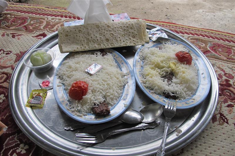 Yaklaşık 2 saat dolaştıktan sonra yemek için nehrin diğer yanına geçtik. Burada bir çok lokanta ve galyan yeri bulunmakta. Bu sefer menümüzde bir diğer meşhur iran yemeği var: Çelo Kebap. Bu kebap yağsız ve tuzsuz bir pilav eşliğinde verilen bizim Adana kebap tarzı bir kebap. Porsiyonlar gerçekten büyük. Tereyağını ufak bir pakette yanında veriyorlar.