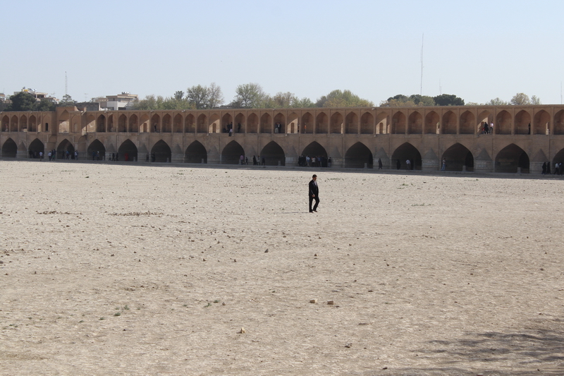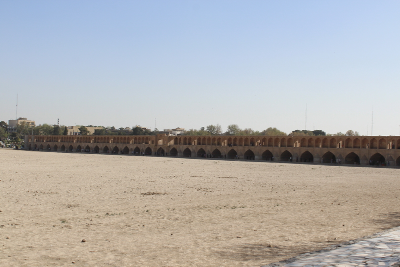 Ardından kentin en önemli yapılarından olan ve kentin simgesi haline gelmiş olan  Si-o-se Pol köprüsünü görmeye gidiyoruz. Bu köprü kenti ikiye bölen Zayendeh nehri üzerindeki 6 köprüden biri. Gerçi şu an nehir kurumuş. 1602 senesinde yapılmış olan 33 sütunlu köprü, mimarı olan Allahverdi Köprüsü olarak da anılıyor. Köprü üzeri tam bir şenlik yeri gibi.