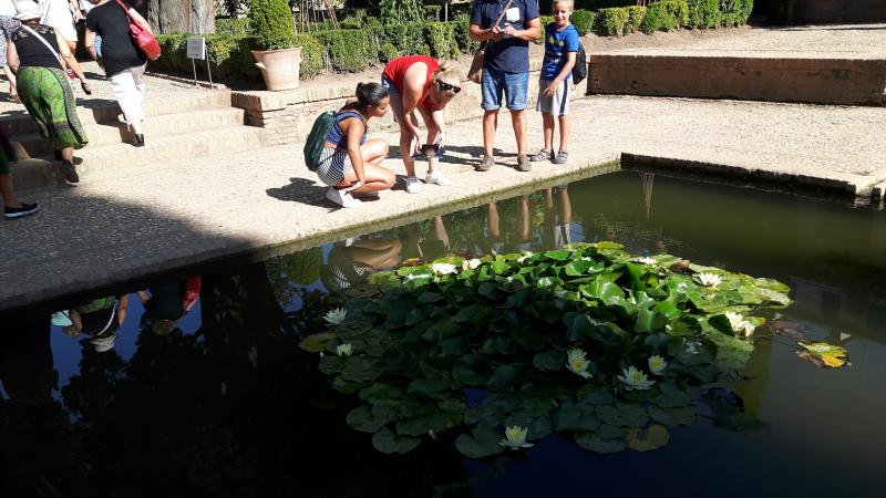 14. yüzyılda kurulan El Hamra'nın bahçesinde adeta klimalar var. Araplar bir devir daim sistemi kurarak, suyun karmaşık biz düzen içinde sürekli akmasını sağlamış. Gerçekten de sarayın bahçelerinde dolaşırken dört bir yandaki kanallarda şarıl şarıl sular akıyor, ellerinizi dokunmadan geçmeyin sulara.Yeşil bahçelerin içinden geçerken, nilüfer çiçeklerinin kabardığı süs havuzlarını izlerken huzur buluyorsunuz. Ünlü Aslanlı Avlusu’nda ayları temsil eden on iki aslan, yuvarlak bir havuz yalağının etrafında gücü anlatıyor. Dolambaçlı kanallar suyun daha çok dolaşmasını sağlıyor ve ortamın sıcaklığını düşürüyormuş. Şehirde 40 dereceleri bulan hava sıcaklığı El Hamra'nın bahçelerinde hep 28 derece civarında kalabiliyormuş.