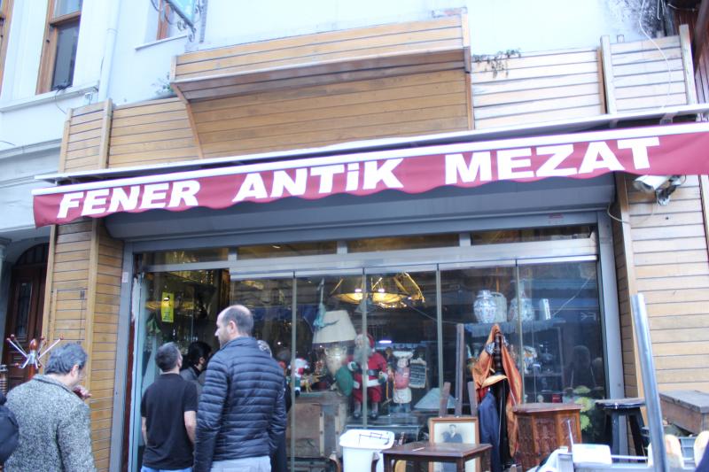 Bol yokuşlu rengarenk Fener sokaklarını turlayıp tekrar sahile doğru iniyoruz. Tam sahile iniyorduk ki içinden "satıyorum satıyorum" nidaları ile bağıran bir dükkan bizi kendine çekti. Burası Fener Antik Mezat, içeride her türden eski eşya açık arttırma usulü satılıyor.