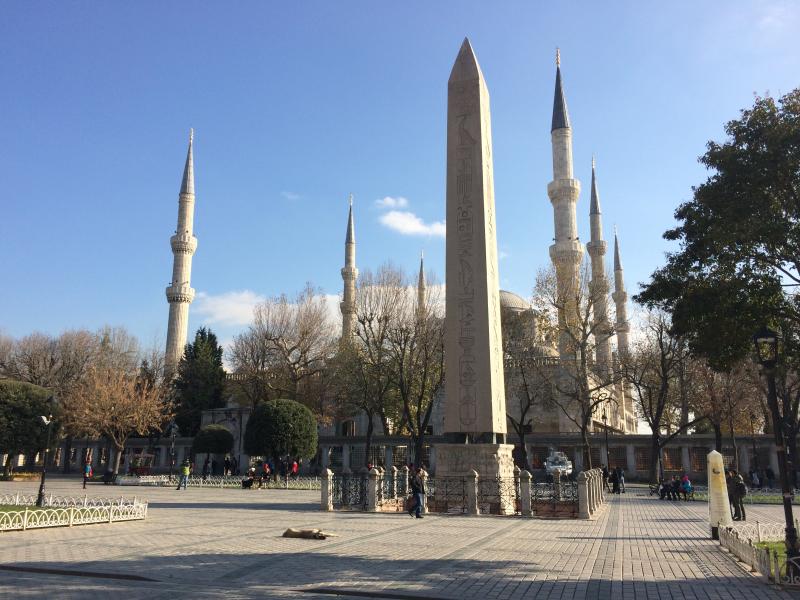 Bu Dikilitaş, Theodosius zamanında Mısır’dan İstanbul’a getirilmiş 390 yılında… Üzerinde, bu anıtın Mısır’dan geldiğini gösteren simgelerden olan hiyeroglifler var. Bir yandan asırlardır buraya ait, bir yandan başka bir toprağın yapısı…