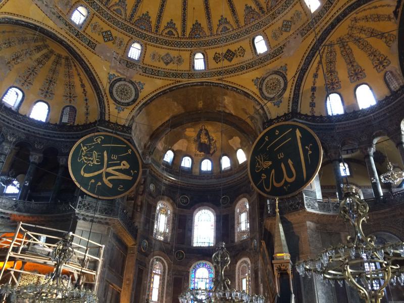 Geçmişe gidelim… Ayasofya 537 yılında, kilise olarak yapılıyor ve 1453 yılında İstanbul’un Osmanlı hakimiyetine geçmesinin ardından camiiye çevriliyor. Cumhuriyet kurulduktan sonra, Atatürk döneminde, 1935 yılında, Atatürk tarafından müzeye çevriliyor ve bugün hala müze olarak ziyarete açık… Müzenin içerisinde, yapının hem camii, hem de kilise geçmişini yansıtan şeyler mevcut. Bir yandan mimber ve mihrap duruyor, öte yandan mozaikler… Dört tarafta Allah, Muhammed, Ali ve Ebubekir yazan Arapça “madalyonlar” dururken, bir yanda ise Hristiyanlığın sembollerini yansıtan mozaikler sergileniyor.