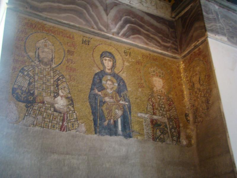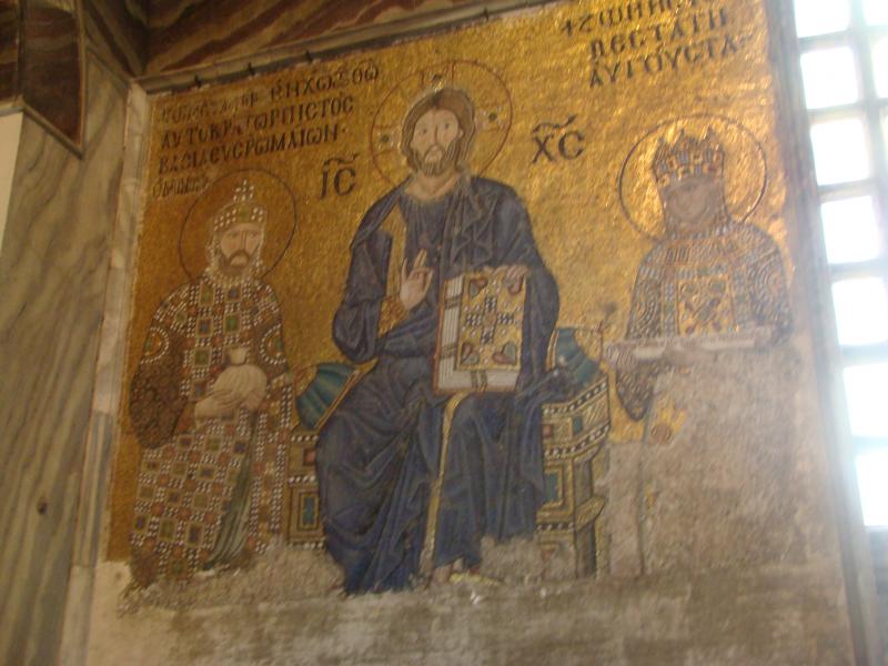 Bir diğer önemli mozaikte de Hz. İsa'nın İmparator 9. Konstantin Momomachos ve eşi Zoe'yi takdis edişi gösteriliyor. İmparatoriçe Zoe, birçok evlilik yapmış olmasına rağmen 50'li yaşlardan sonra ilk evliliğini yaptığı Romanos Argyros'la beraber tasvir edildiği Ayasofya'daki mozaik ile ölümsüzleşmiş. Ancak kocalarının ölümünden dolayı yaptığı her evlilikte mozaikteki Zoe tasviri sabit dururken kocasına ait yüz kazınıp yenisi resmedilmiş. Şu an mozaikte son kocası Momomachos'un yüzü bulunuyor.