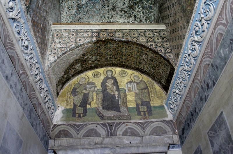 Narteksin dışında kalan yan kapıyı kullanarak müzeden çıktığınızda kapının üstünde göreceğiniz ayna aslında arkanızda kalan ve muhtemelen kaçırdığınız muhteşem bir mozaiğe dikkatinizi çekmek için yerleştirilmiş. 10. yüzyıldan kalan mozaikte İmparator Konstantin, Meryem Ana'ya adını taşıyan şehrin maketini, İmparator Jüstinyen ise Ayasofya'nın modelini sunarken betimlenmiş.