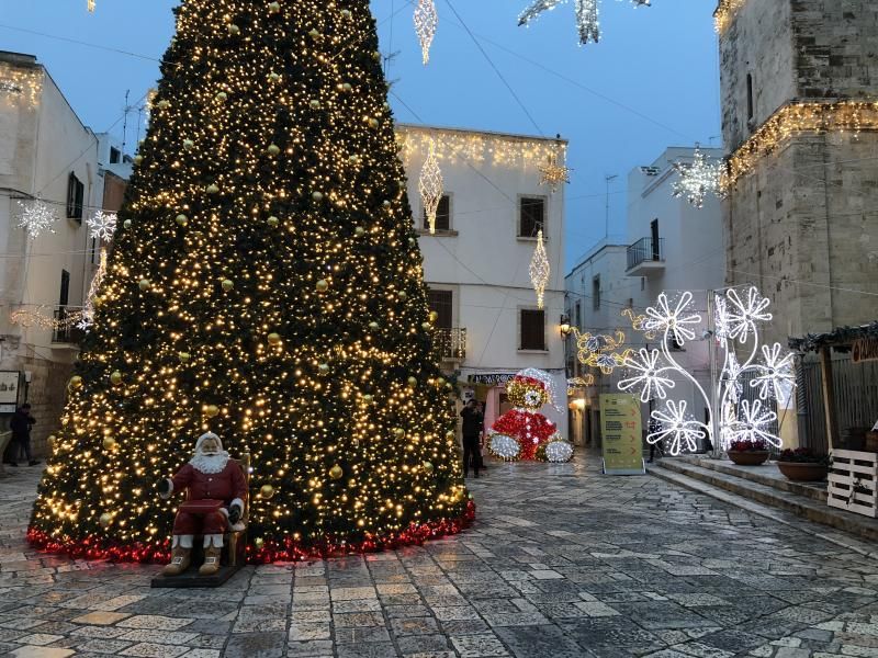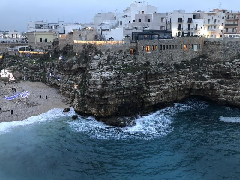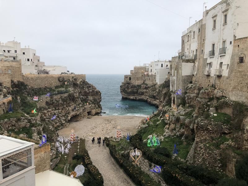 Bari’ye yaklaşık 30 dk mesafede yer alan bu sahil kasabası bizim de bölgede ilk ziyaret ettiğimiz yerdi. Kasabanın tüm tanıtım broşürlerinde yer alan kireçtaşından kaya aralığı, Polignano a Mare’nin halk plajı aynı zamanda. Turkuaz bir denize sahip olan Polignano a Mare’nin anlamı “deniz kıyısındaki küçük yer”. Yerleşik nüfusu 20 bini bulmayan bu yerleşim yaz aylarında turistlerle dolup taşıyor. Biz gittiğimizde Christmas zamanı olduğundan çok şık ışıklandırılmıştı tüm kasaba.