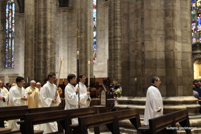 Katedralin içi çok kalabalıktı. Pazar ayini var diyeceğim ama günlerden pazar değil. Ama biri kürsüde konuşma yapıyor. Herkes pür dikkat konuşanı dinliyor. Konuşmanın ardından dini ileri gelenler yerlerinden kalkıp mahiyetleriyle birlikte katedrali dolaşmaya ve selamlamaya başladı.