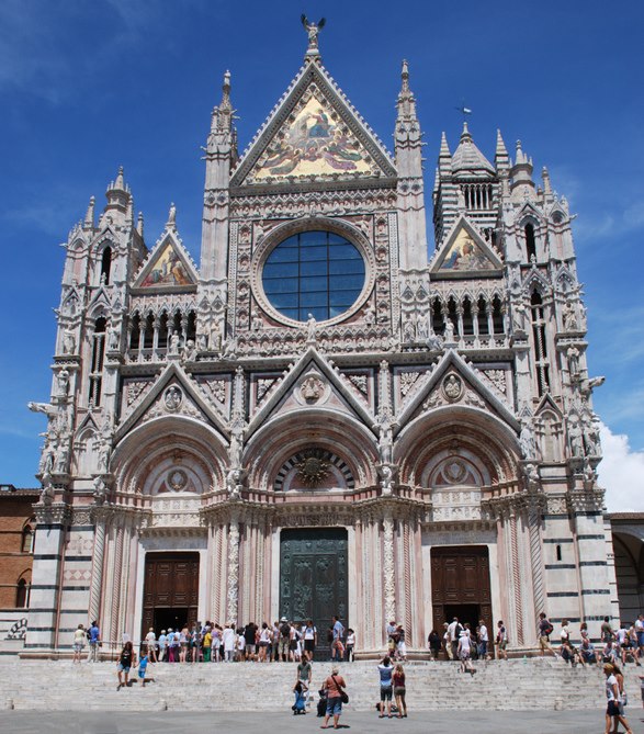 Katedraller ülkesi İtalya'da, gerçekten dünyanın hiçbir yerinde olmayan güzellikte mimari yapıları görmek şaşılacak bir durum değil. Siena'yı gezerken aklıma hep İtalyanlar'ın tarihi nasıl bu kadar iyi koruduklarına dair sorular geldi. Milano'daki muhteşem Duomo'ya benzer şekilde Siena'da da eşsiz mimarisiyle bütün turistlerin ilgisini çeken bir Duomo mevcut. "Duomo" İtalyanca "katedral" demek. Katedralin dış kısmında pek çok azizin heykelleri, süslemeler yer almakta. Duomo'nun üst kısmında yer alan üçgen şeklindeki bölümlerde İsa ve havarileri varaklı, yaldızlı desenlerle resmedilmiş. Ayrıca katedralin orta kısmında bulunan yuvarlak camlı bölmede İsa'nın son akşam yemeği de resmedilmiş ancak bu manzara sadece katedralin içinden görülebiliyor. Katedralin içinde pek çok sanat eseri, dini hikayeler görmeye değer. Ünlü İtalyan sanatçı Bernini'nin de pek çok eseri katedralde bulunuyor. Siena'nın ünlü kurt-kadın simgesi ve heykelleri katedralin hemen her noktasında mevcut.