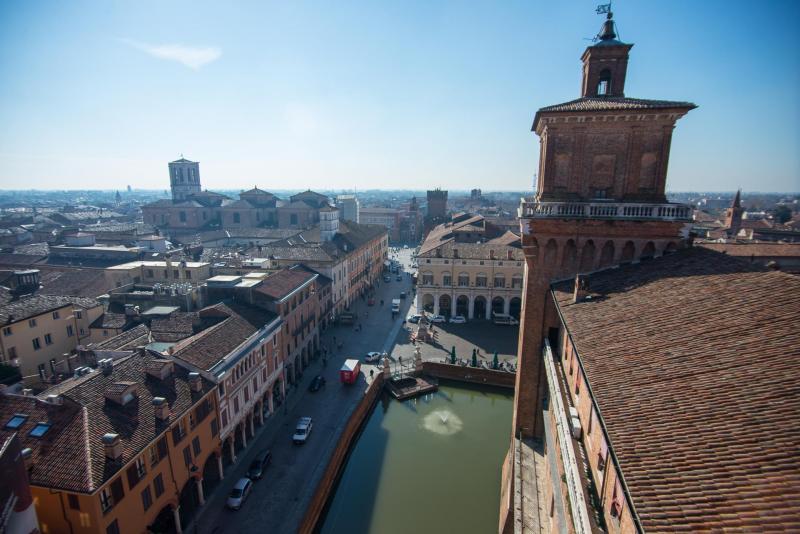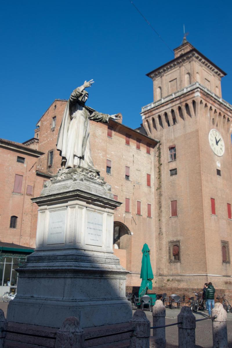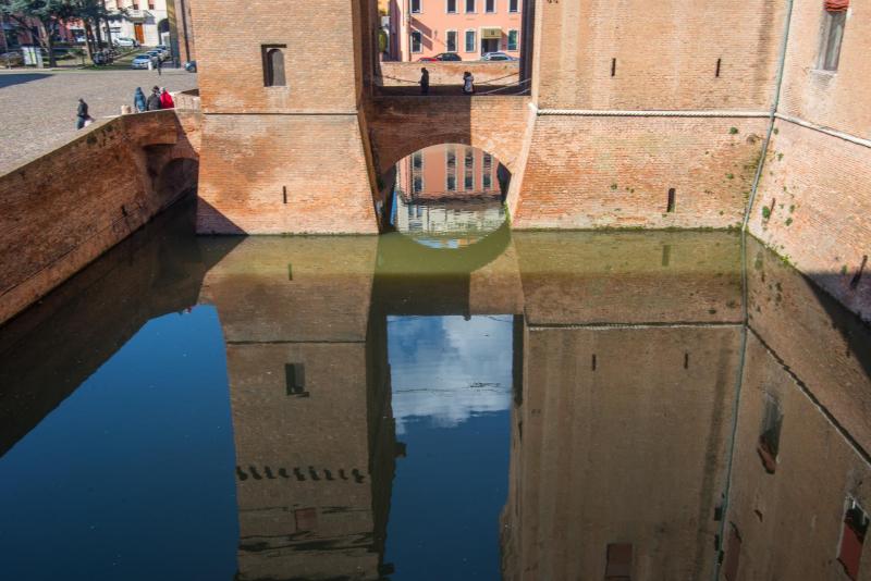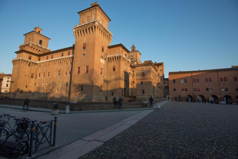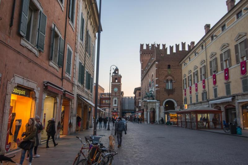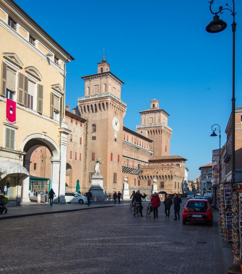 Bologna’dan hızlı tren ile sadece 25 dakika uzaklıktaki bu küçük kasaba olduğu gibi saklanabilmiş tam bir Orta Çağ kasabası. Resimlerinden görüp beğendiğimiz şato ise neredeyse kasabanın tam ortasında. Üstelik Ferrara, büyük şehirlerin Old Town’unu aratmayacak büyüklükteki meydanı ve meydanın etrafındaki yapılarıyla tam bir Rönesans kasabası. 2016 yılında 132.000 yaşayanı ile UNESCO Dünya Mirasları Listesi’ne girmiş bir kasaba.