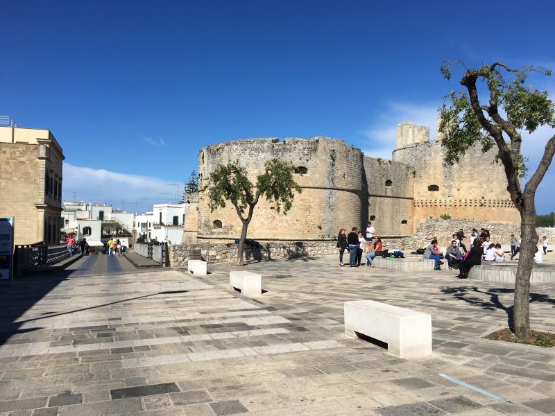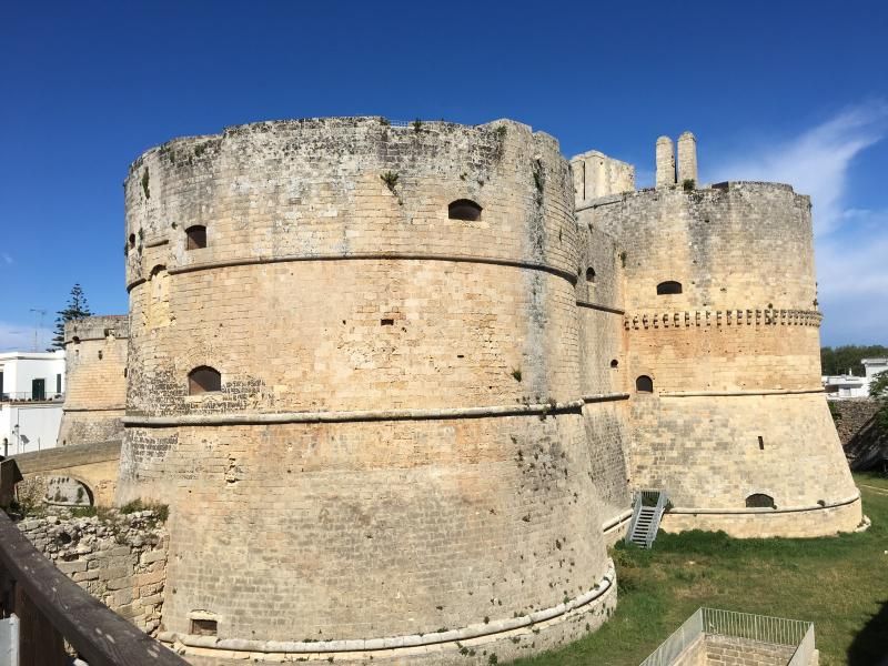Old Town ara sokaklardan hafif tepeye kıvrılan yollarla tepedeki Otranto kalesine varıyoruz. Otranto Old Town’u UNESCO’nun koruması altında olan yerlerden biri. Kasaba, İyon ile Adriyatik denizinin buluştuğu yerde, Faro della Palascia deniz feneri yaklaşık 5 kilometre uzunluğunda bu iki denizin sahilini aydınlatıyor.