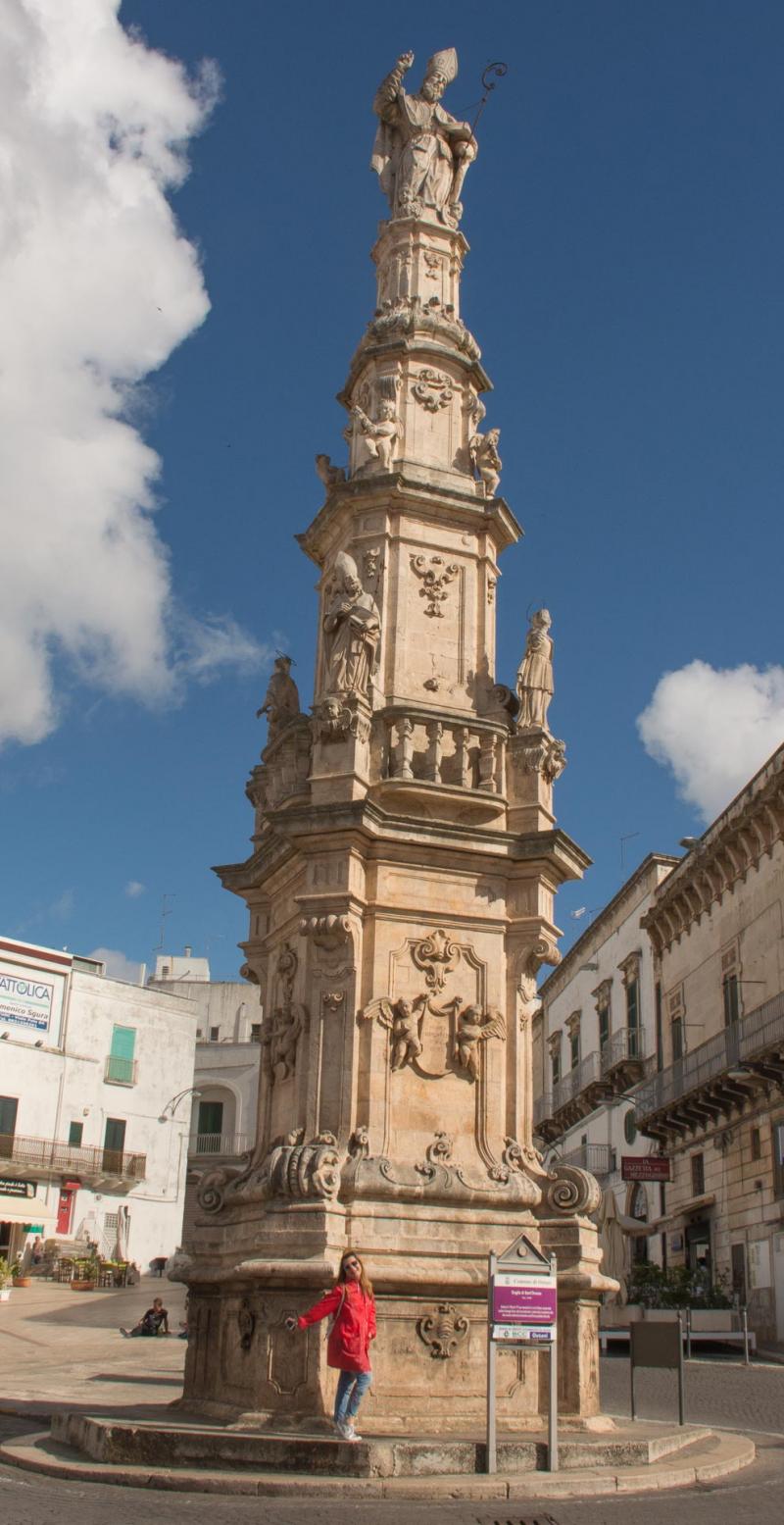 Nasıl bir yere geldik yine, eski uygarlıkların kadim bir sırrı gibi şehir gözlerimizin önünde yükselirken biz yine zevkten dört köşe vaziyetteyiz. Ostuni Meydanı'ndaki Saint Oronzo heykeli bütün ihtişamı ile göğe yükseliyor. Bu tatilde kendime en çok kızdığım geniş açı bir lens ile gelmemiş olmam, böyle geniş alanlarda alınan sonuçlar çok güzel oluyor, özellikle de böyle heybetli yapıları kadraja sığdırmaya çalışırken.