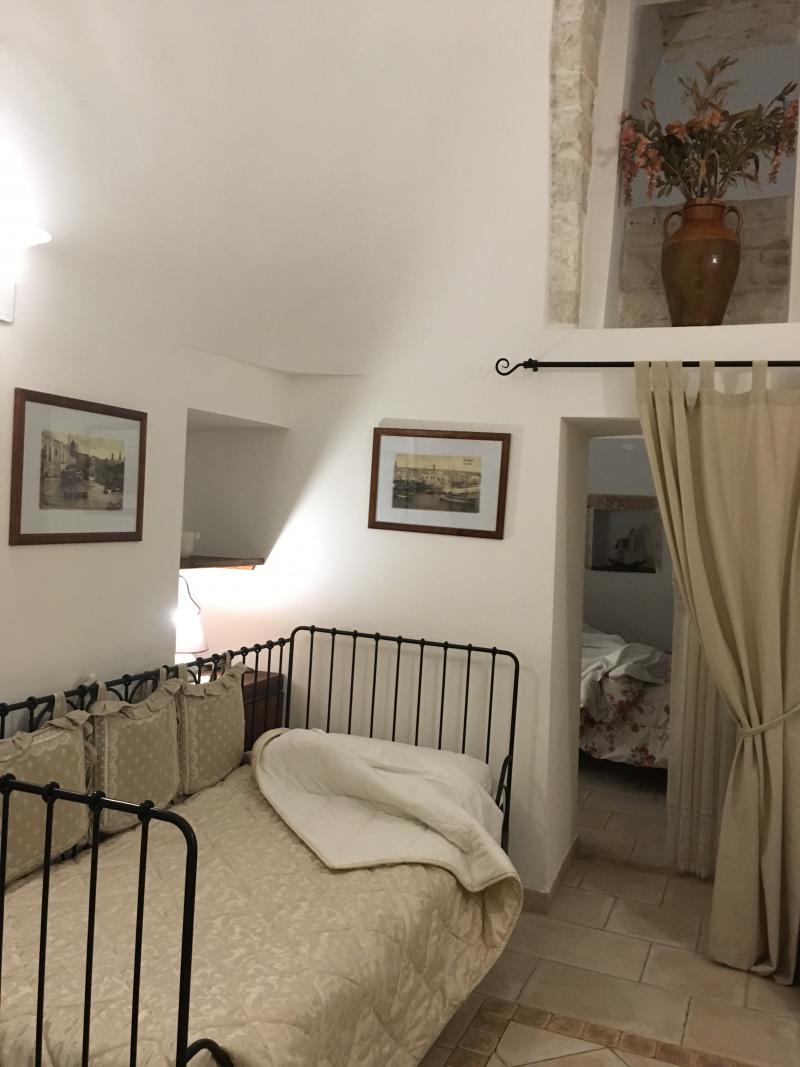 Bir sonraki rotamız geceyi geçireceğimiz ve İtalya’ya gelmeden önce tek ayırttığımız yer; Alberobello’da bir trullo evi. B&B Mirella’da kalacağız. Gün geceye kavuşurken anca varabiliyoruz. Pansiyonun sahibi Rosa, odamızı gösterdiğinde küçük çocuklar gibi seviniyoruz, ne kadar sevimli bir oda. Belli ki üç kişi olduğumuz için arası perde ile bölünmüş iki odalı, çatısı trullo evi çatısı olan en büyük odada biz kalıyoruz.