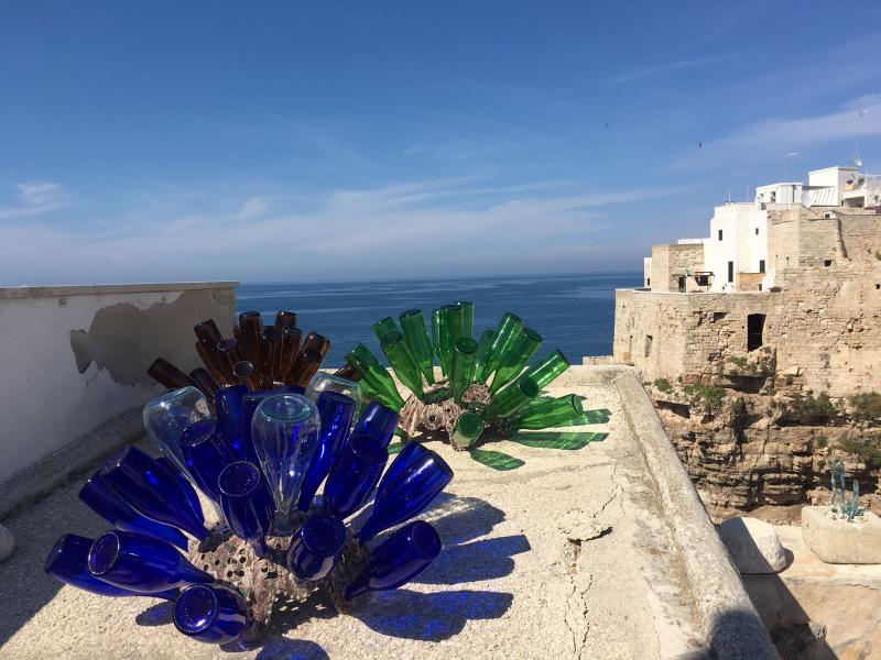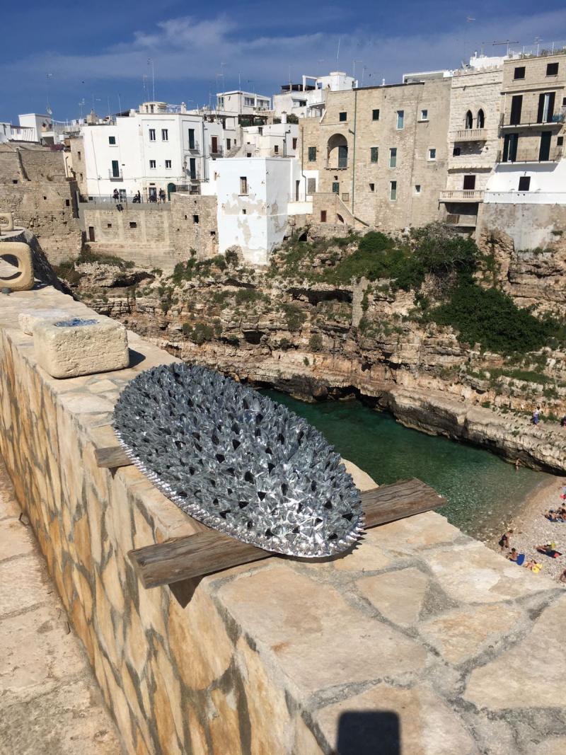 Polignane a Mare de bulunan eskiye ait paralar buranın antik Yunan döneminde Apulia’nın Neopolis’i olduğunu kanıtlıyormuş. Via Traiana Köprüsü de Romalılardan kalma. Dolaşırken Ayhan Sicimoğlu’nun programında bahsettiği, hatta çekim yaptığı cam sanatçısı Peppino’nun dükkanına da rastlıyoruz.