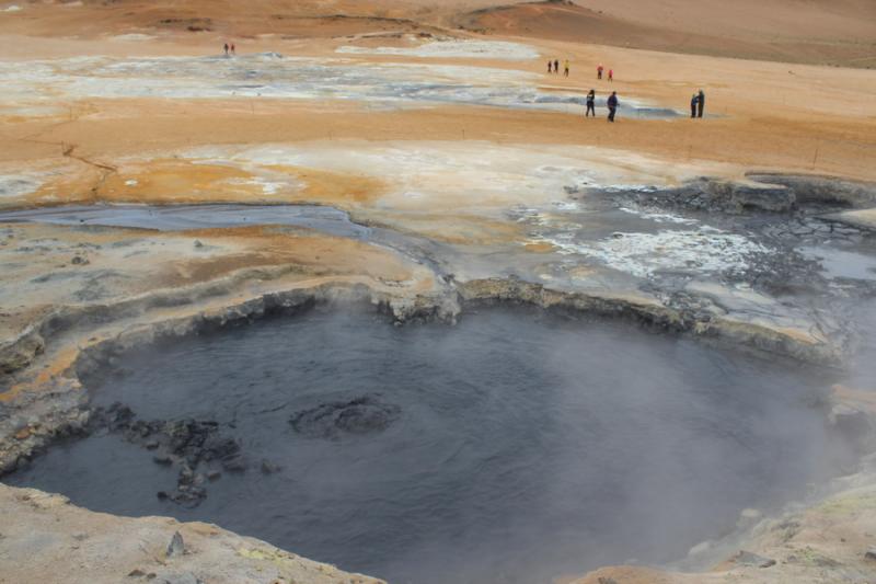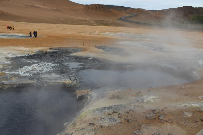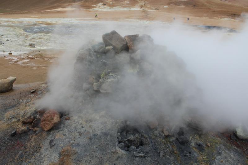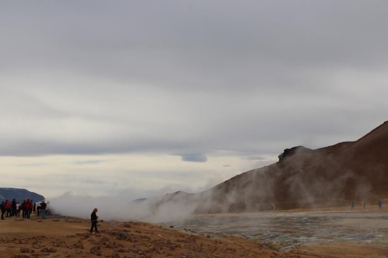 Buradaki kısa mola ardından Akureyri’ye 92 kilometre mesafede yer alan kaynak sularının ve gayzerlerin bulunduğu Namafjall Hverir bölgesine geldik. Daha yaklaşmadan bile sıcak su kaynaklarından yükselen buhar kümelerini görebiliyorduk.