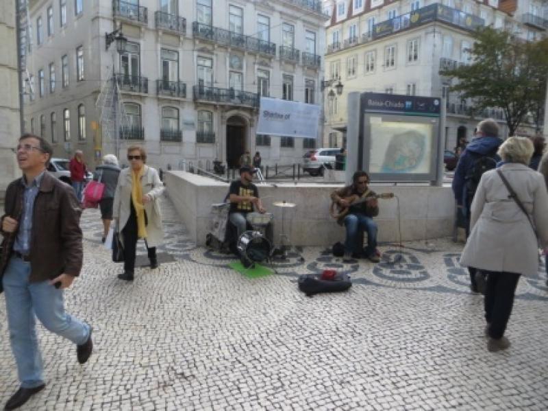 Bu arada turistler için Lizbon simgesi Zorro olmuş komedyeni de sizler için fotoğraflamadan geçemedim. Şimdi eski kraliyet sarayı, şimdi müze olan binanın arasındaki meşhur Rua Augusta (caddesine) giriyoruz. Sağlı sollu dükkanları seyrederek ilerliyoruz ve 2. kesişen caddede sola bakınca şehrin üst tarafı ile kolay ulaşımı sağlayan Gloria asansörüne geliyoruz. Burada tadilat olduğundan yukarıya, sol tarafından caddeleri ve dükkanları, sokak satıcılarını temaşa ederek yürüyoruz. Tabii ki bu arada sokak çalgıcılarını seyretmeden geçmiyoruz.
