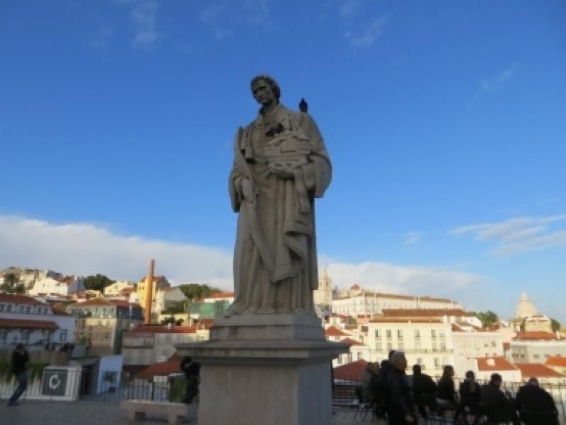 Bakın fotoğraftaki tramvay raylarını görüyorsunuz değil mi? Her yeri böyle tramvay raylarını takip ederek gezmeye başladık. Sonrasında yine durakta beklerken küçük bir midibüs önümüzde duruyor ve bakıyoruz herkes biniyor, biz de biniyoruz. Nasıl olsa bedava günlük biletimiz var ya... Epey bir yokuş çıkıyoruz. Tabii ki tramvayın çıkamayacağı yerlere belediye, küçük otobüsler koymuş. Bir meydana geliyoruz ve herkesle birlikte iniyoruz. Haydaa bakın nereye geldik. Şehri tepeden, hele gemimizi tam profilden gören nefis bir manzara ile karşı karşıyayız. S. Vicente heykelinin bulunduğu Largo das Portas do Sol Meydanı’na geliyor ve seyir terasından sizlere bu fotoğrafları çekiyorum.