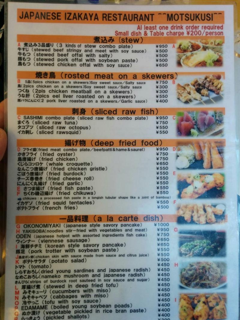 - İzakayalarda yani Japon yemek mekanlarında menüler uygun olarak şu şekilde: