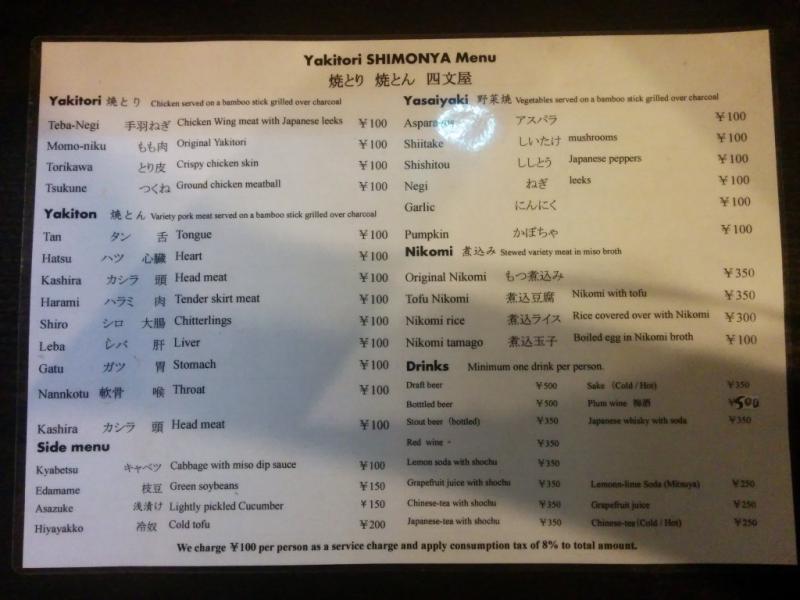 - Yakitori: Bildiğin çöp şiş ama farklı olan şey sosları. Tatlı sos ile servis ediyorlar ki şahane oluyor =) Tokyo'da Shimonya'da Yakitori en iyilerinden. Çok ucuz lokal bir mekan. Menü aşağıda...
