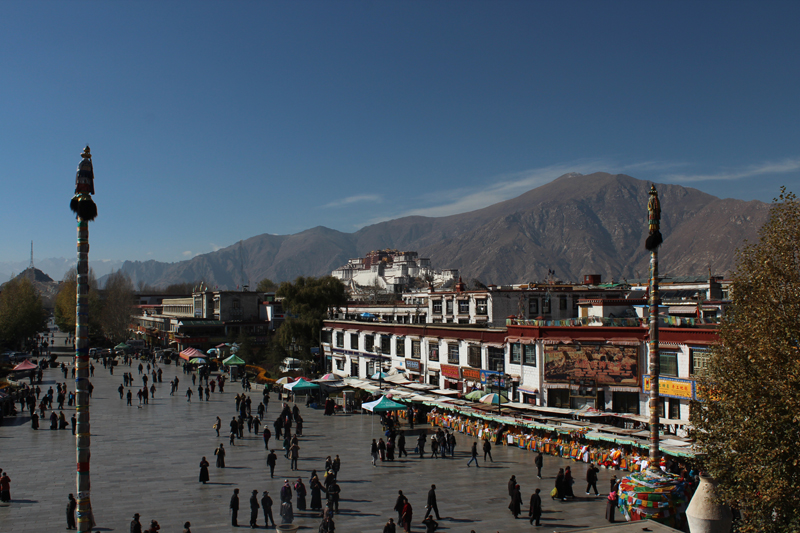 Tapınağın önündeki Barkhor meydanı ve çevresinde çok sayıda alışveriş yapılabilecek dükkan ve sıra sıra dizilmiş tezgahlar var. Tibet’te alışveriş yaparken dikkat etmeniz gereken en önemli şey, istedikleri fiyatın onda birini teklif etmek. Çünkü satıcılar önce çok yüksek fiyat verip sizden olumsuz tepki alınca, hesap makinesini uzatıp “son ne veriyorsun?” diye soruyor. Bu arada kullandıkları hesap makineleri sesli, ingilizce konuşan neredeyse hiç yok. Eğitim seviyeleri bir hayli düşük. Genelde de sokaklarda yoğunlukla satılan patates, pirinç, tahıl ve şekerli gıdalarla besleniyorlar.