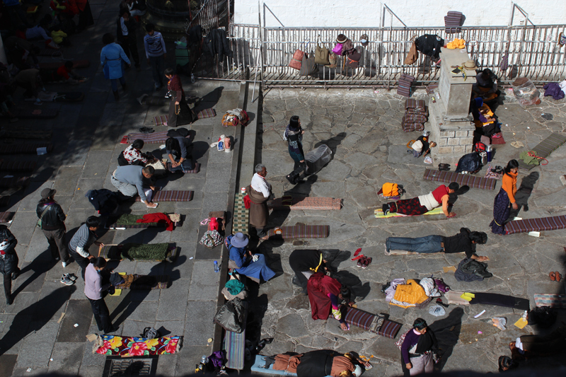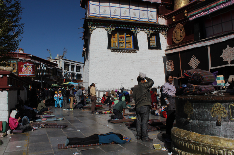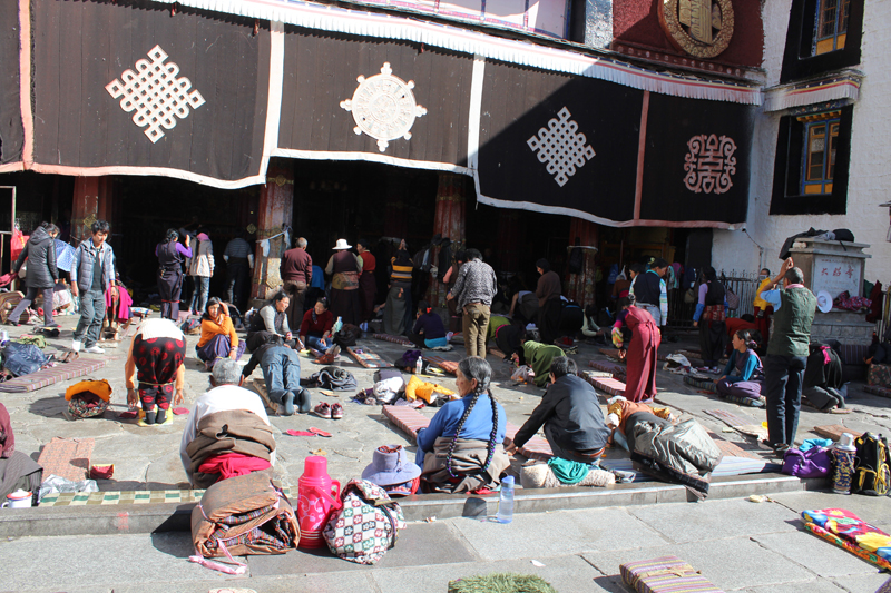 Jokhang Tapınağının önü, girişi ve tüm çevresi ibadet yapan Tibetli’lerle dolu. Çok kalabalık. Tapınakların giriş kapıları, hep batıya bakıyor ve kapıların üstünde boylu boyunca Tibet şans sembolleri asılı.