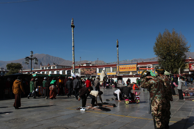 Meydanda ve ara sokaklarda bol miktarda polis ve asker var. Polisler hep sırt sırta konuşlandırılmış. Çatılarda bile asker vardı. Belli ki Tibet için için kaynıyor. Ancak polis ve askerlerin fotoğraflarını çekmek kesinlikle yasak.