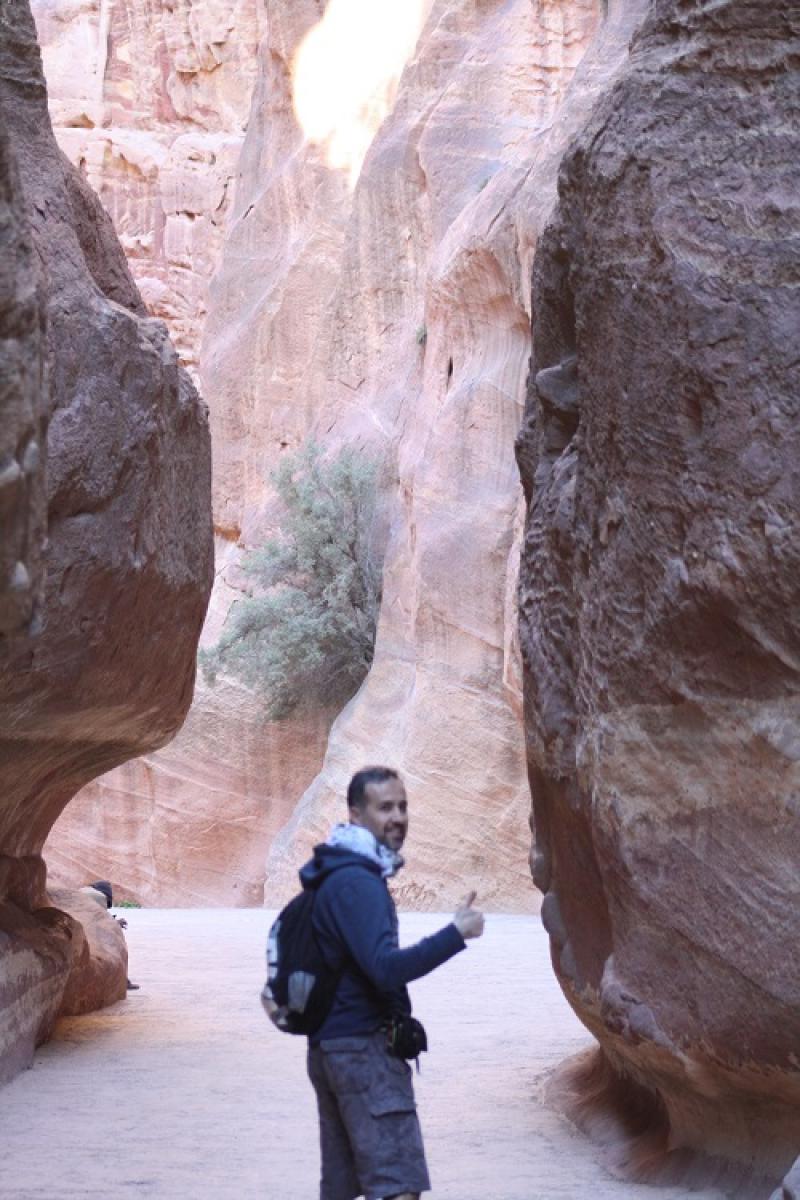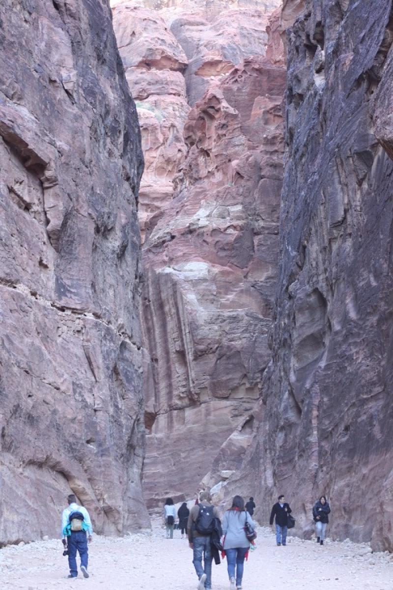 Petra antik kenti için bilet kontrolünden sonra yürümeye başlıyoruz. Düzgün toprak bir yol. Sol taraf at ve develer için. Vadinin iç kısmına doğru ilerledikçe coğrafyanın değişimine şahitlik ediyoruz. Yaklaşık 200 metre sonra ilk kaya işçiliği örneği Obelisk Tomb’a varıyoruz. Bu yapının bir mezar alanı olduğu söylense de Nebatiler’de konuk ağırlamak için kullanılan bir yer olabileceği de söyleniyor. Fotoğraflarımızı çektikten sonra yolumuza devam ediyoruz. Şimdi kentin girişinde yer alan ve yaklaşık 1,5 km uzunluğunda yer yer genişliği 2-3 metreye kadar daralan yüksek kayaların arasından ilerlediğimiz As Siq’deyiz. Bu vadiyi görünce Nebatiler’in neden buraya yerleştiklerini anlayabiliyor insan. Bu muazzam vadiye giren bir ordu burada sıkışıp kalır. As Siq’de yürürken yol kenarındaki su kanalları dikkatimizi çekiyor. Nebatiler şehre düzenli kanallar ile su getirmeyi başarmışlar.