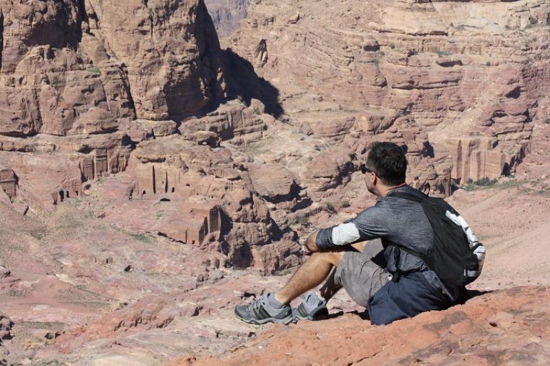 Hemen ilerimizde Roma döneminde kalma amfitiyatro var ama biz klasik rotanın dışına çıkıp dağın üst tarafından ilerleyip kurban kesme alanını göreceğiz (High Place of Sacrifice). Rotamıza vadinin solundaki belli belirsiz merdivenleri takip ederek tırmanmaya başlıyoruz. Burası şehre gelen turistlerce çok kullanılan bir rota değil. Issız keçi yolu benzeri yolda zaman zaman dinlenerek tepenin etrafını dolaşarak ilerliyoruz. Her eski uygarlıkta olduğu gibi Nebatilerde de tanrılara kurban sunmak var. Bunun için vadiyi tepeden gören yüksek alanı seçmişler. Burada yerde yuvarlak bir kesim alanı dikkatimizi çekiyor. Kesilen hayvanın kanı bu oluktan aşağıya akıyor bir yerde toplanıyor. Ama manzara harika.