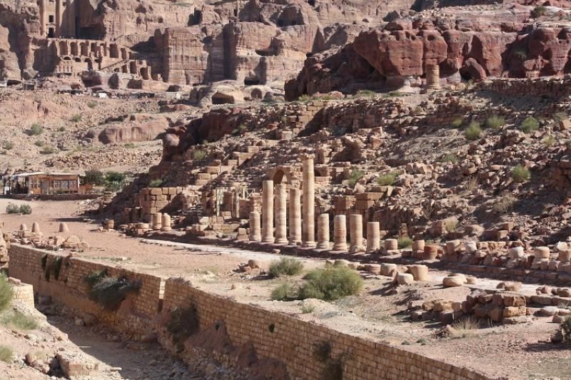 Şimdi yolumuzun üzerinde Roma döneminden kalma şehrin ticaret merkezi sayılan Colonnaded Street‘e geliyoruz. Şehrin en canlı olduğu dönemlerde yüksek sütunlar ile şekillenmiş caddenin genişliği yaklaşık 6 metre. M.S. 363'te büyük depremde bu Roma sütunları yıkılmış ve bir daha da yenileri yapılamamış. Caddenin sonunda vadi içinde ilerliyoruz karşı yamaçtaki devasa kaya mezarlarını görüyoruz.