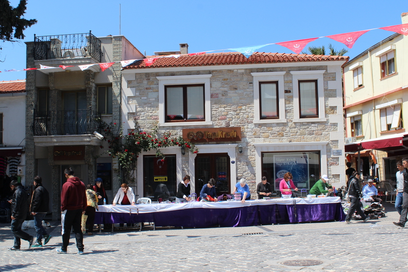 Sabah çayı, boyoz eşliğinde karşıda kermes hazırlığında olan Foçalı kadınları izliyoruz.