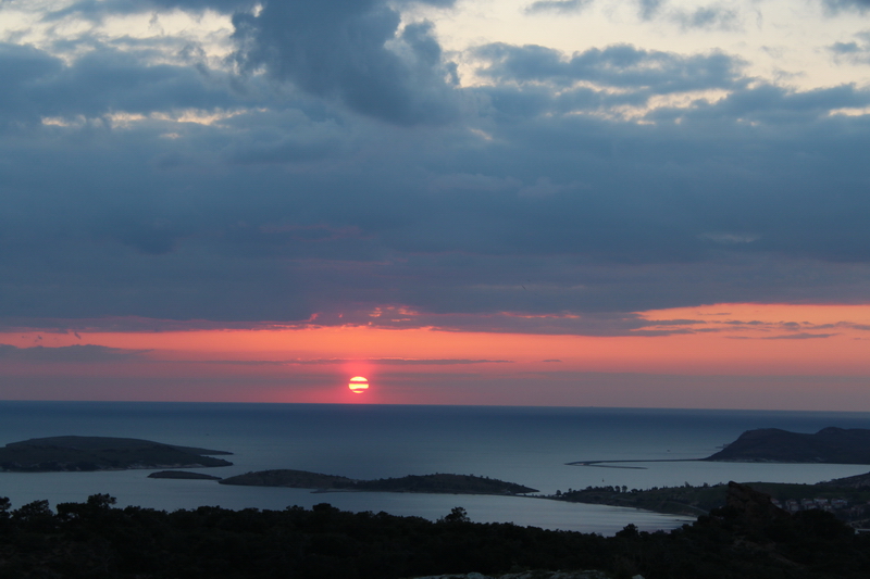 Foça’ya yaklaştığımızda güneş batmak üzereydi. Güneşi Foça’da batırmak üzere arabayı bir tepenin üzerinde durdurup, ünlü tarihçi Homeros’un çok etkilendiği Siren Kayalıkları üzerinden güneşin batışını izledik, İzmirli usülü. Nasıl mı? Birer bira ve midye dolma eşliğinde. Güneşin battığı saatler belki de günün en güzel zamanları. Gökyüzünde oluşan renkleri izlemekse ayrıca keyifli.
