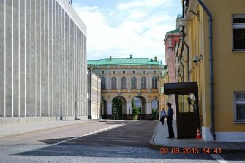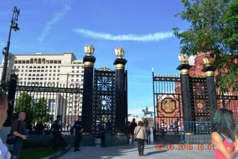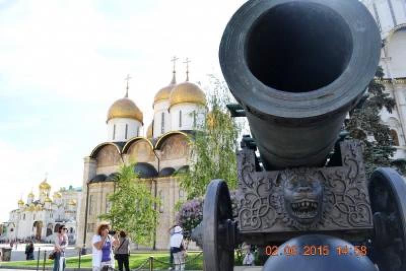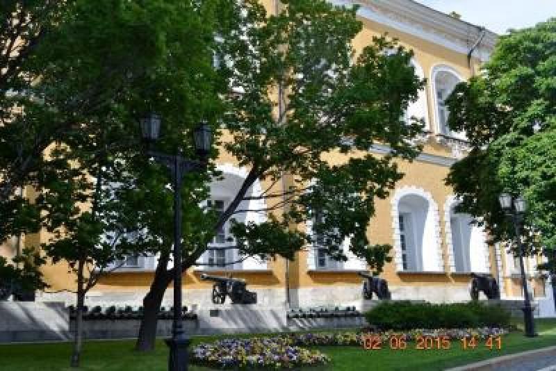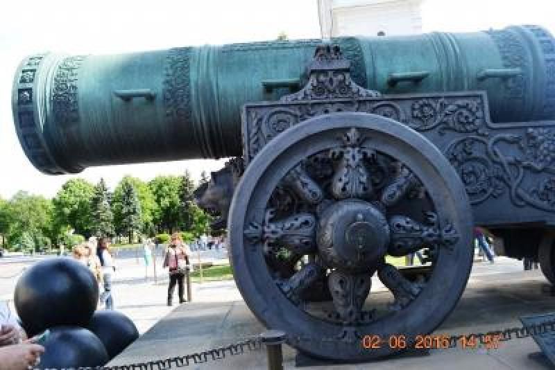 Başkan'ın ve çalışanların kullandığı, biz turistlerin saray bahçesine girdiğimiz kapıdan başka müthiş bir giriş kapısı daha var, kapıda bekleyen ve kuş uçurtmayan zımba gibi nöbetçileri ile muazzam görünüyor. Ancak rehberimizin söylediğine göre son yıllarda Bay Putin Saray'ına artık helikopterle gelip gitmeye başlamış. Bu arada hemen söylemek isterim biz bahçeyi gezerken hemen 200 metre ilerimizde bir hareketlenme oldu, bahçede bizleri izleyerek gezen polisler yola inmemizi engelleyecek şekilde dizildiler. Bizler de kameralarımızı hazır edip beklerken 5-6 siyah uzun, içinde kimler olduğunu anlayamadığımız arabalar önümüzden geçerken askerler etraflarında kuş uçurtmuyorlardı ancak fotoğraf çekmemize de engel olmadılar. Biz gezmeye devam ediyoruz. Karşımızda dev bir Top ve top arabası…