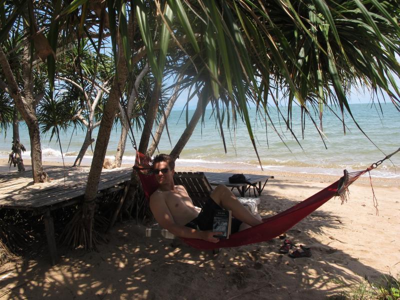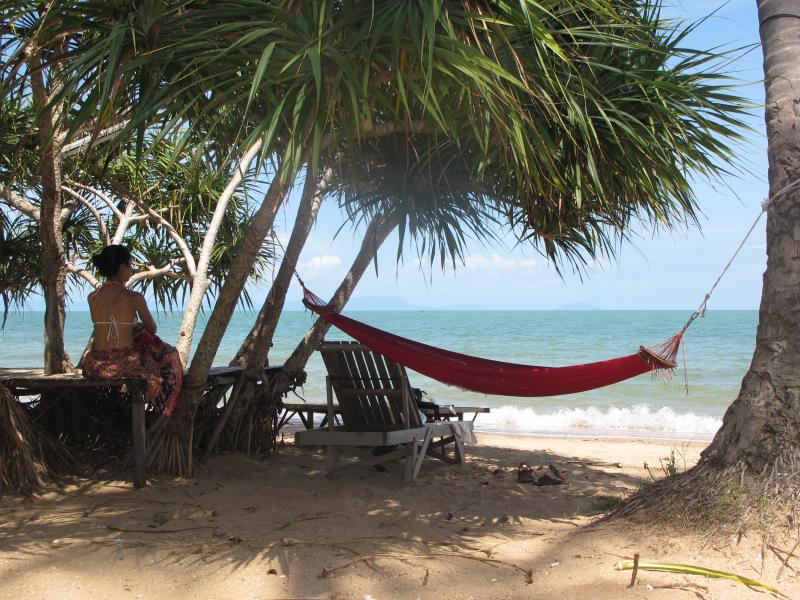 Neyse, benim gibi sırtçantalı maceralara gönül vermiş diğer şehirli kızları, vahşi hayat koşulları konusunda uyarma görevimi tamamladıktan sonra, ada hayatının güzelliklerine dönebilirim tekrar. Tavşan Adası’nda kaldığımız iki gün boyunca bol bol deniz, güneş ve kumsaldaki hamakların tadını çıkarıyor, deniz kenarında Khmer masajı keyfi yapıyoruz. Ben 1 aydır yollarda olmanın şerefine, iki gün boyunca kumsaldaki hamaktan sadece denize girmek ya da yemek zamanlarında ayrılıyorum. Til ve diğer sırtçantalılar adayı keşif turuna çıkıyorlar ama 1-2 saat sonra döndüklerinde pek de anlatacak şeyleri yok. Anlaşılan adanın, sadece bizim kaldığımız sahil şeridinde hayat var, geri kalan kısımlarda bazen yürümeye uygun yollar bile yok.