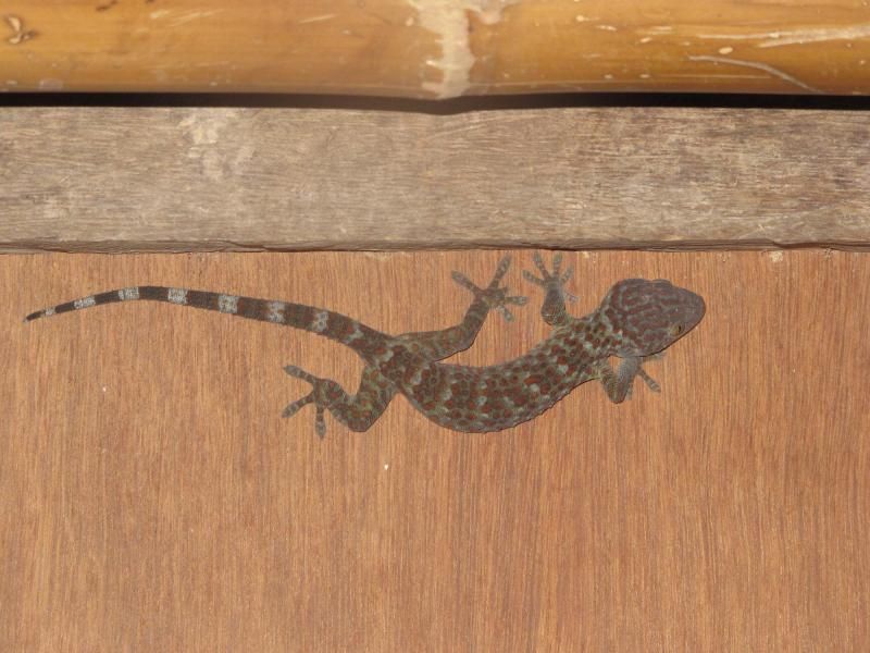 Tabii ki şehir kızının vahşi doğayla savaşı tüm şiddetiyle başlıyor yine; bungalova girer girmez, duvardaki 30 cm. uzunluğundaki kertenkele karşılıyor bizi. Asya’nın küçük ve sevimli “Gecko”larına çoktan alıştım ve hatta sevmeye başladım ama kocaman kertenkelelere karşı mesafeli bir duruşum var hala. Bizi görünce çok kalmaz gider herhalde diyerek, pek üzerinde durmuyoruz (son günümüzün son dakikalarına dek odada bizimle kaldı) ve adanın tadını çıkarmaya başlıyoruz.